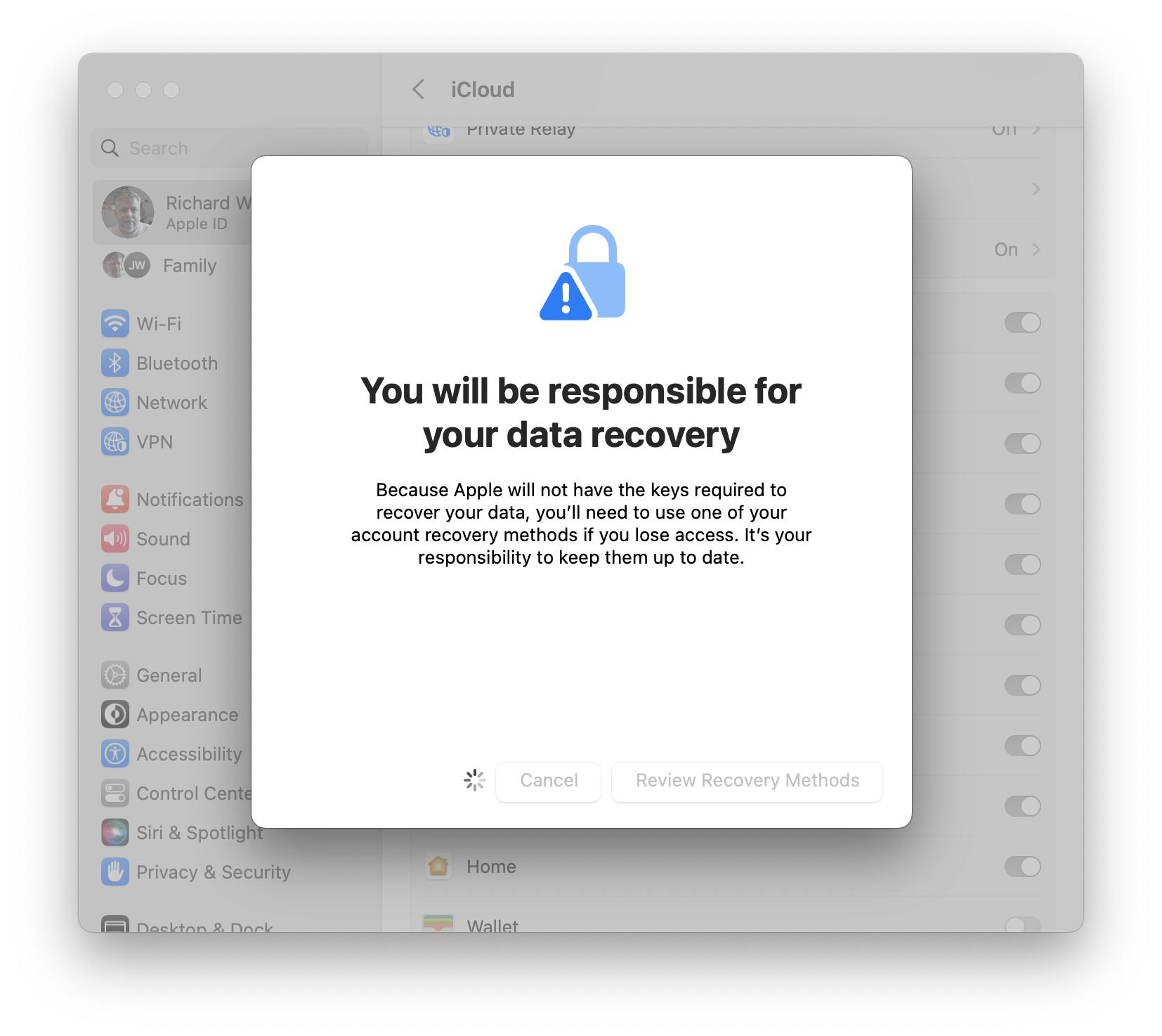 I've tried enabling Advanced Data Protection from two different Macs; after I type in the recovery key, all it does is spin and spin until I get bored and Force Quit Settings. The one that's running now on this MBP has been running like this for about ten hours now: