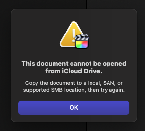 I've been using Final Cut Pro with Dropbox for about 3 years, and now after running some updates these programs don't want to play nicely together. When trying to open a Final Cut Pro library file that is saved to my Dropbox (but synced to my computer and available offline) Dropbox gives an error message that says the file can't be opened from iCloud Drive (even though it's in Dropbox, not iCloud.)