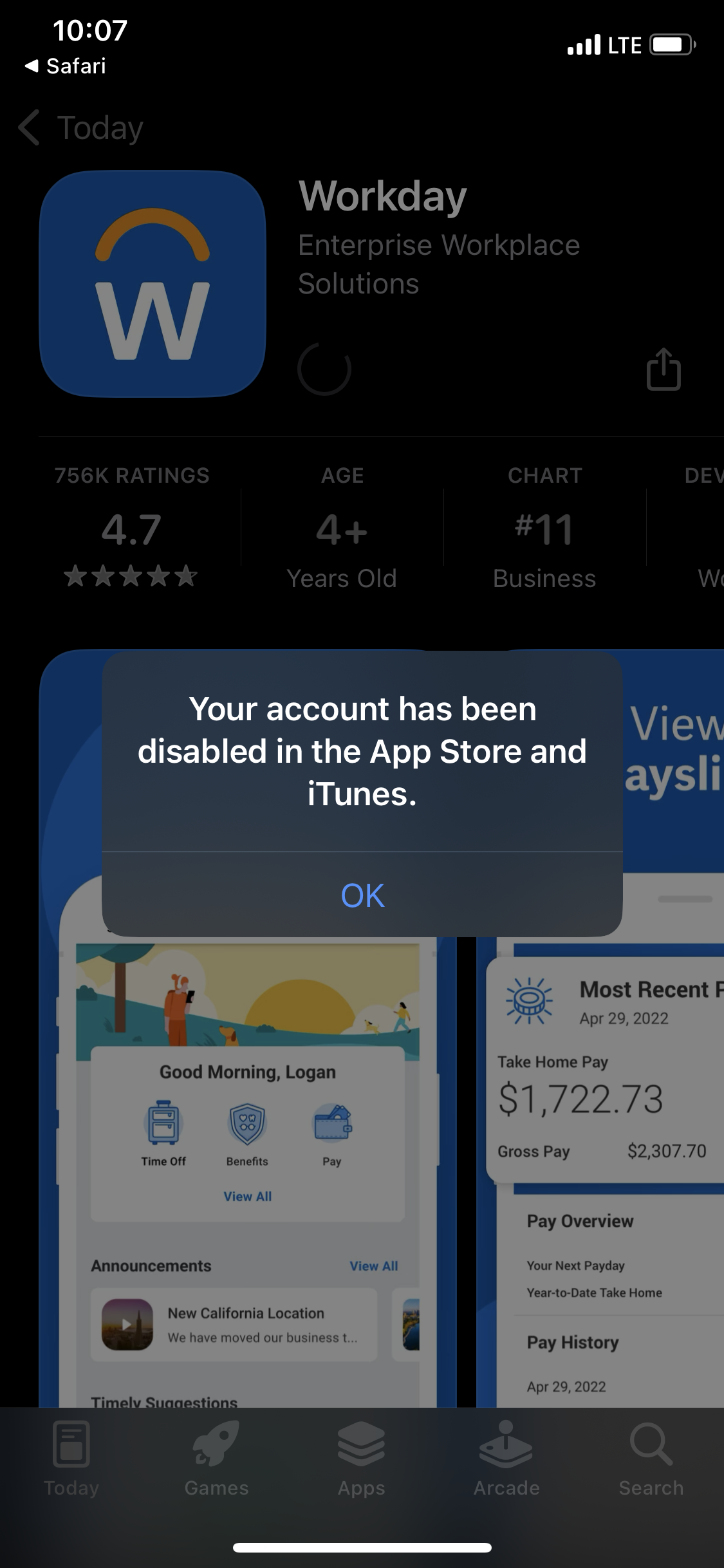 If you see a message that says "Your account has been disabled in the App Store and iTunes", there is a problem with your payment method on your account, to resolve the problem you need help from Apple support, click -> contact Apple Support for help.