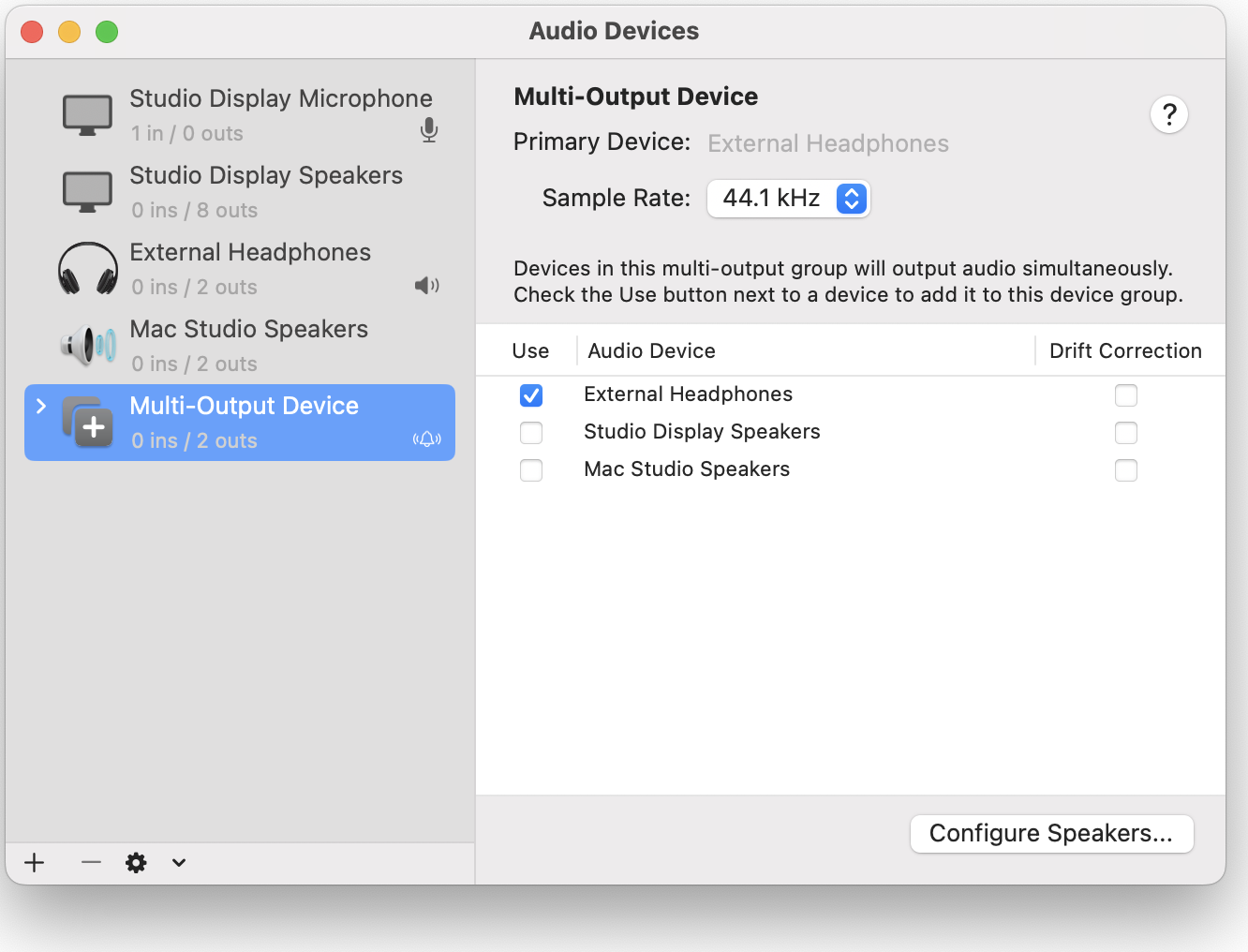 Hello. I'm trying to create a multi output device to play music I've followed what instructions I can find online but I can't get it to work. Interestingly when playing music through Apple Music I can use my set up as multi output automatically, set up is Harman Kardon sound sticks into the headphone Jack and two Sonos ones via Airplay.