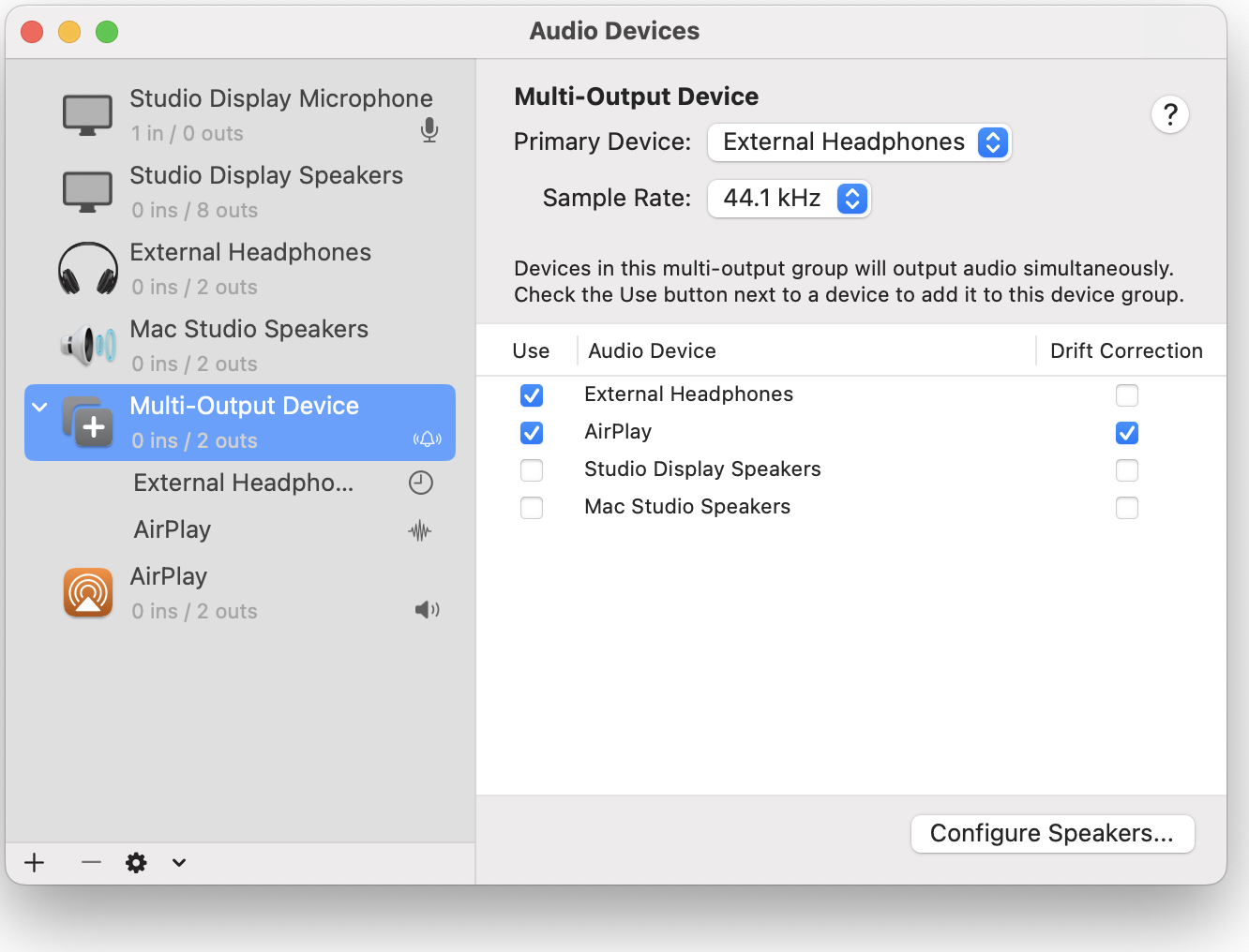 When I create a multi output device even though it shows both airplay and headphone jack it only plays via airplay, then if I switch to head phone jack and then go back to multi output it says airplay device not available? Also when first creating Multi Output it doesn't show any airplay devices at all, I have to add them?