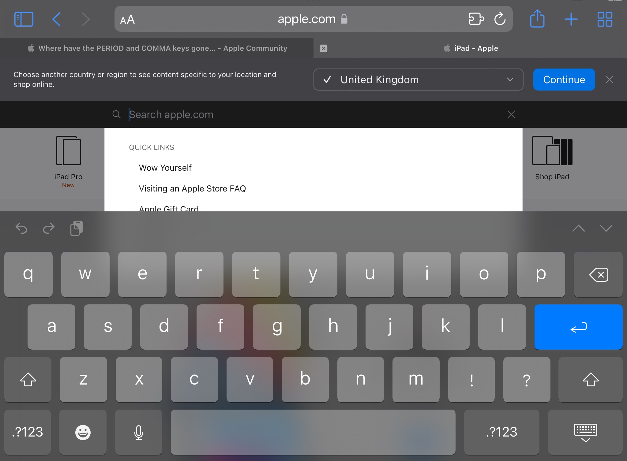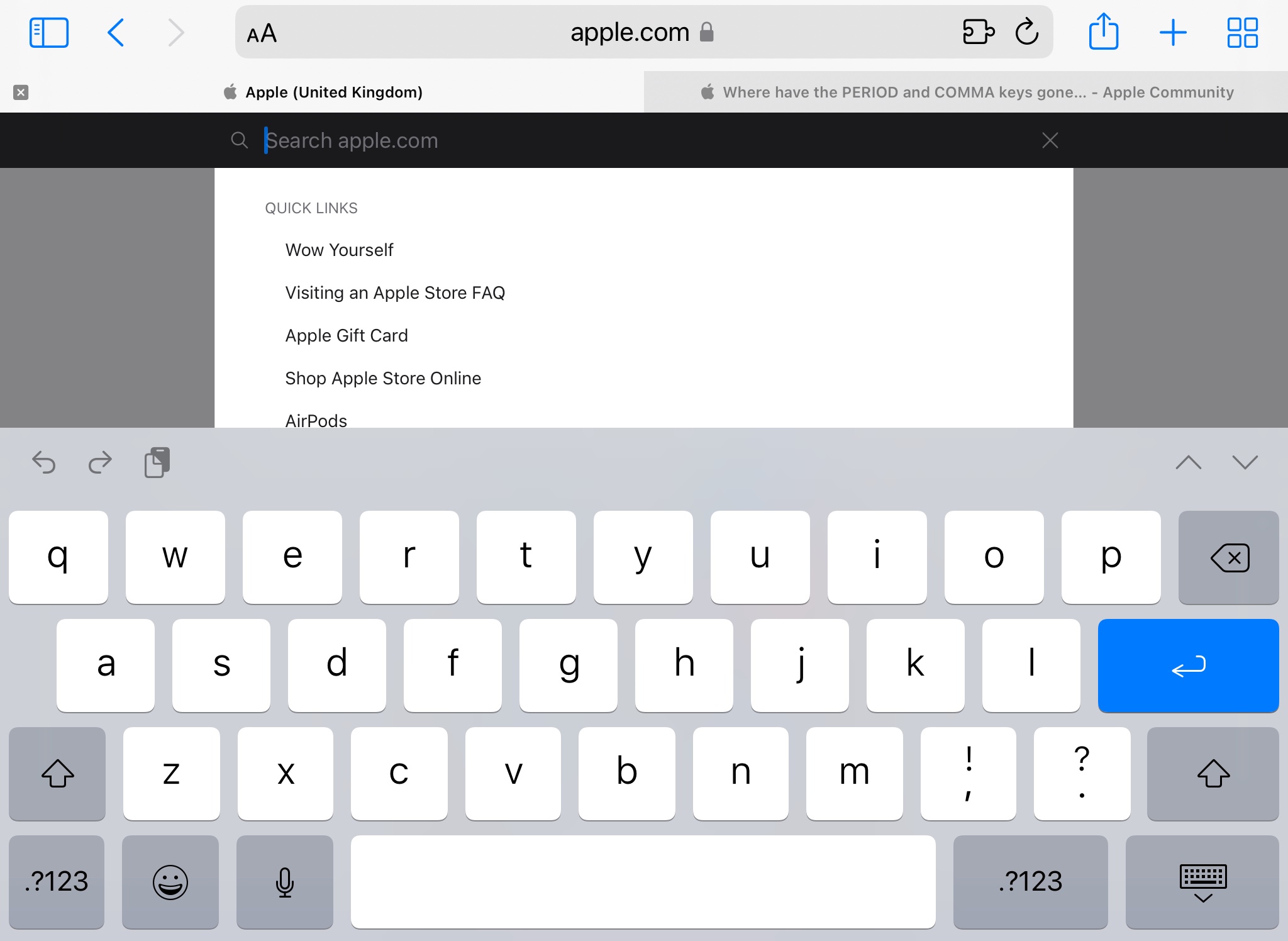Where have the PERIOD and COMMA keys gone, on the iPad OS 15 keyboard?