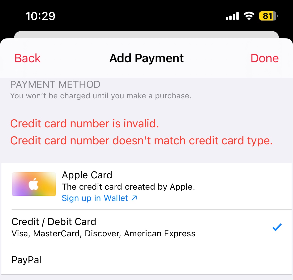 1. The payment method that you are adding is of the same country as that of App Store Country on your iPhone