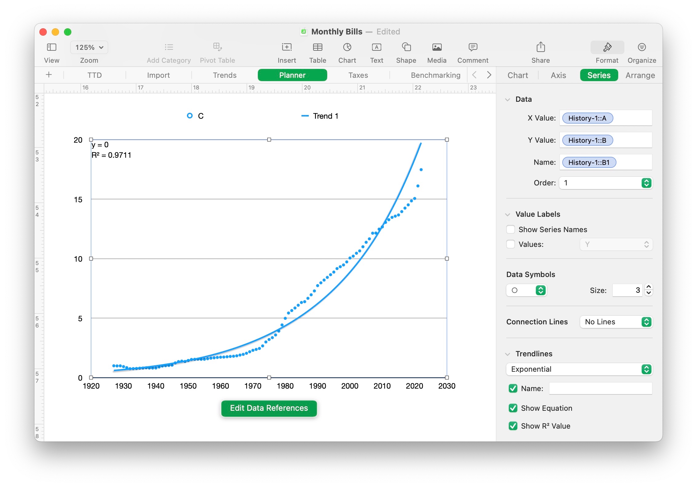 With data similar to yours I get the same result. Given that it came up with a trendline, it should have provided the formula that goes with it. With my rough data I get a trendline of y=1.75E-27*e^(0.032*x). Yours would be similar. While it is a very small number multiplied by a very large number, neither one is near any limits of computing. Works fine in Excel. Looks like a bug. Use the menu item Numbers->Provide Numbers Feedback to report it.