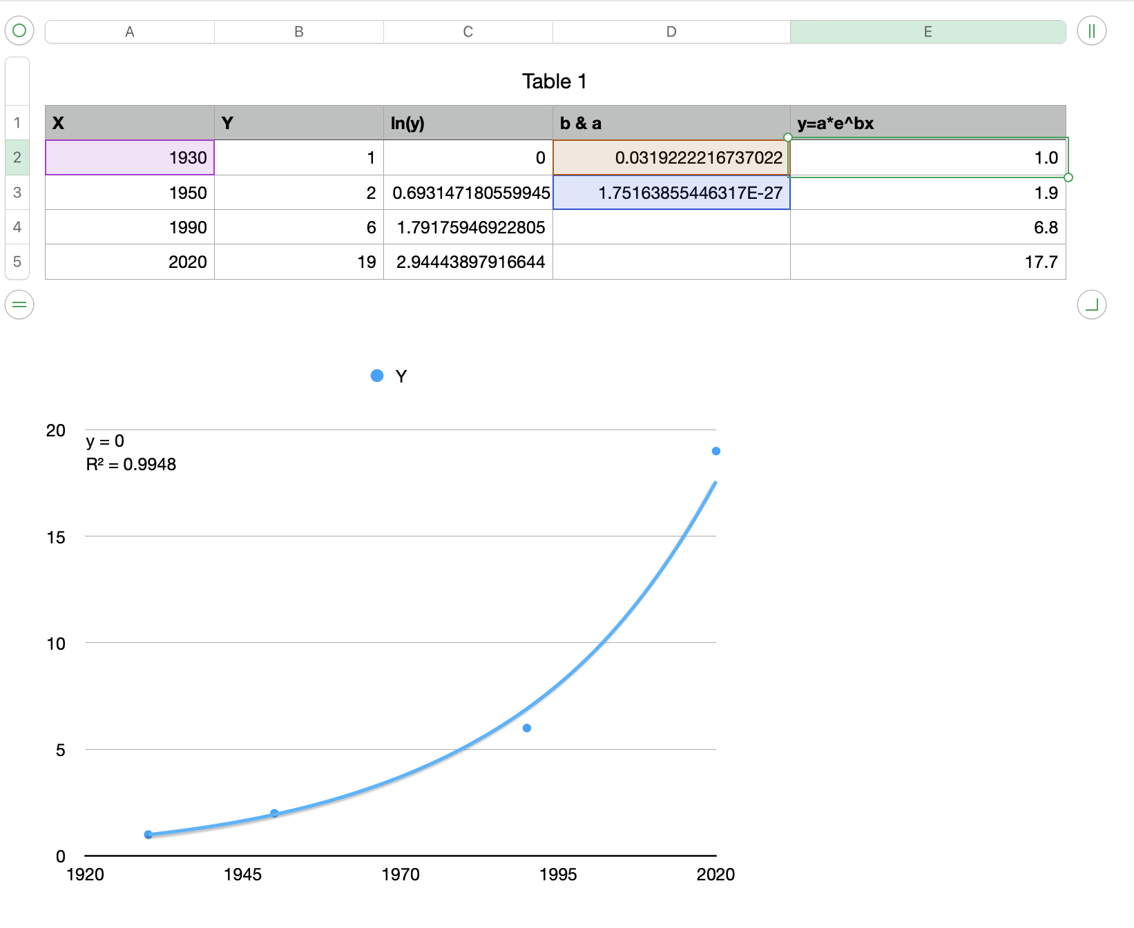 a (cell D3) =EXP(INTERCEPT(C,A))