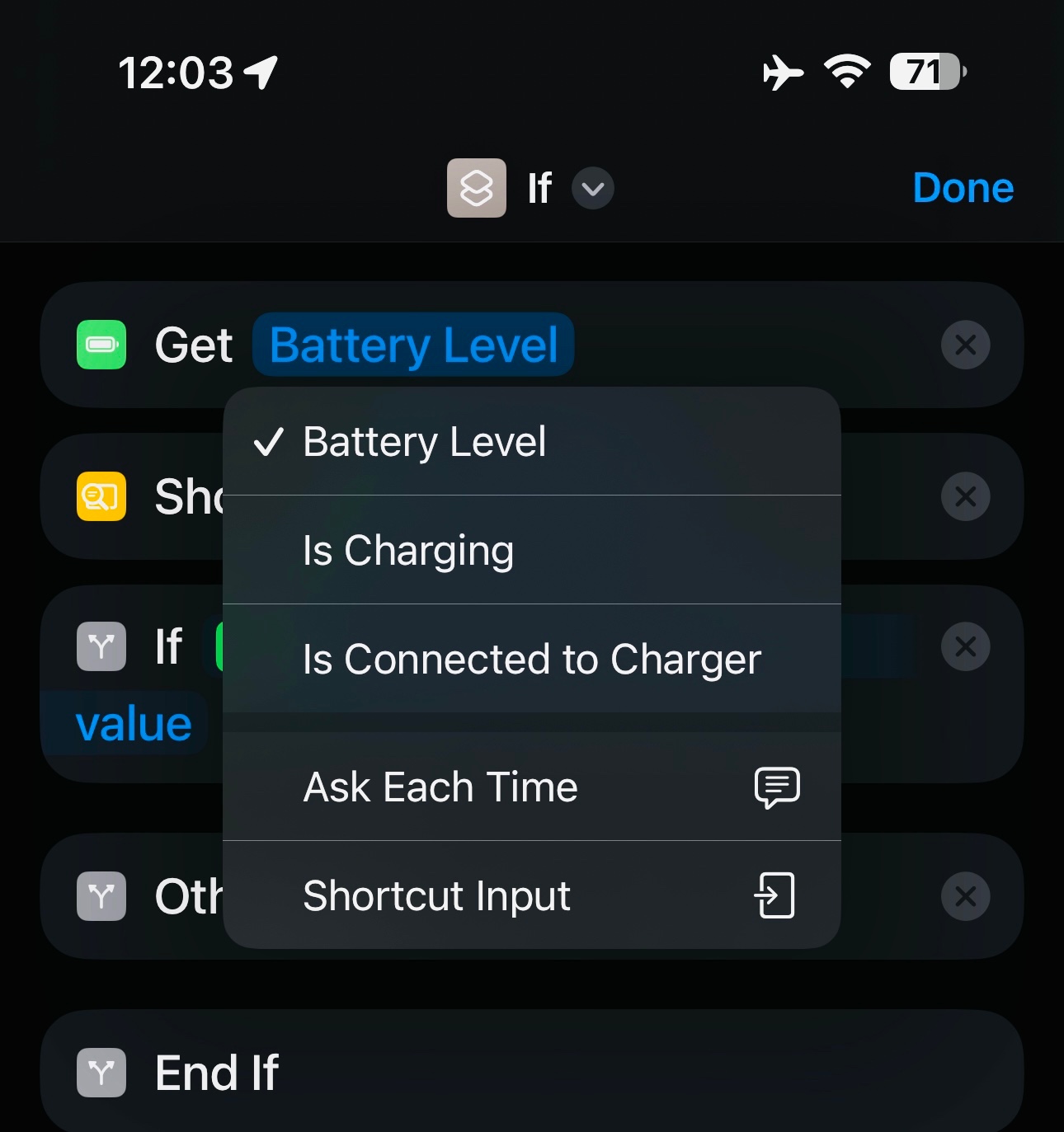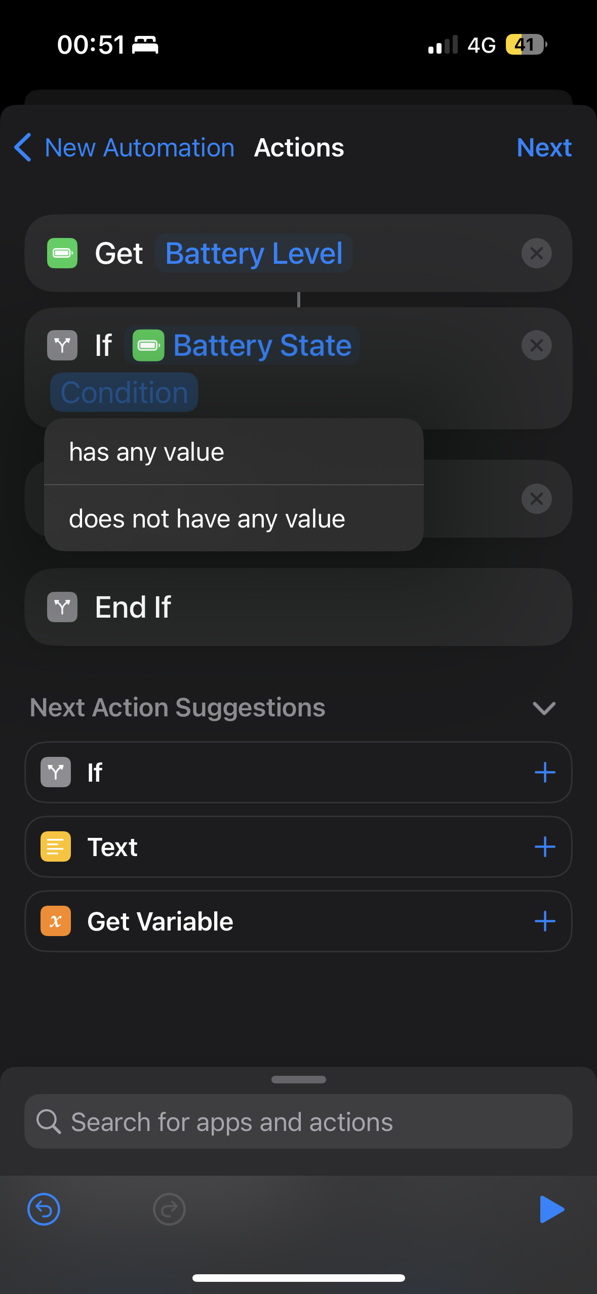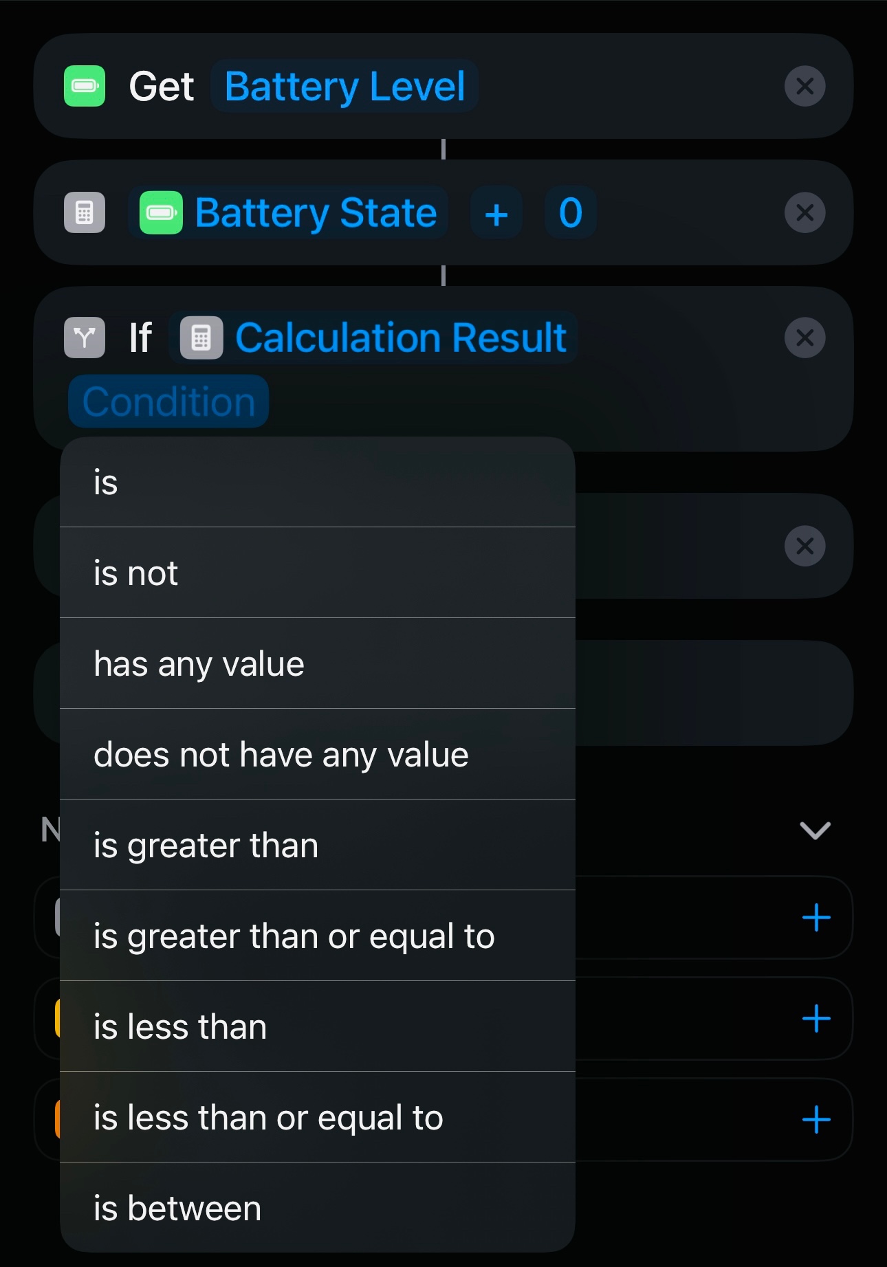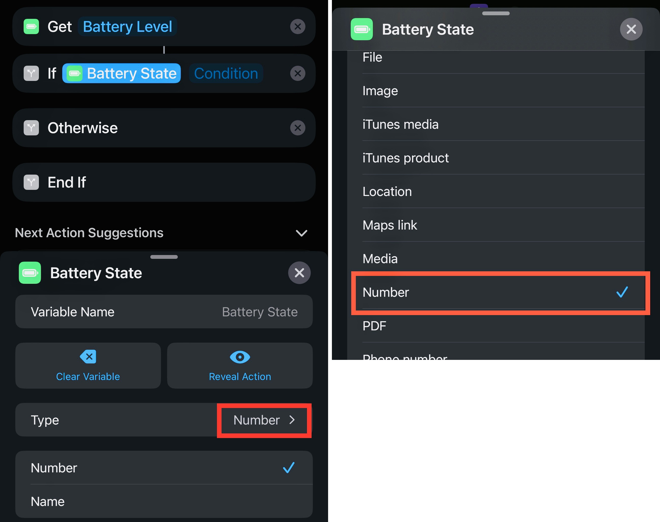 The problem is, that although the variable is a number (I verified that also by building a shortcut that gives me the battery percentage as output), the if condition does not recognise it as such and is therefore no longer giving me the options in red (the first picture this is how the old automation looks like since the update) but only the options in the second picture which do not help.