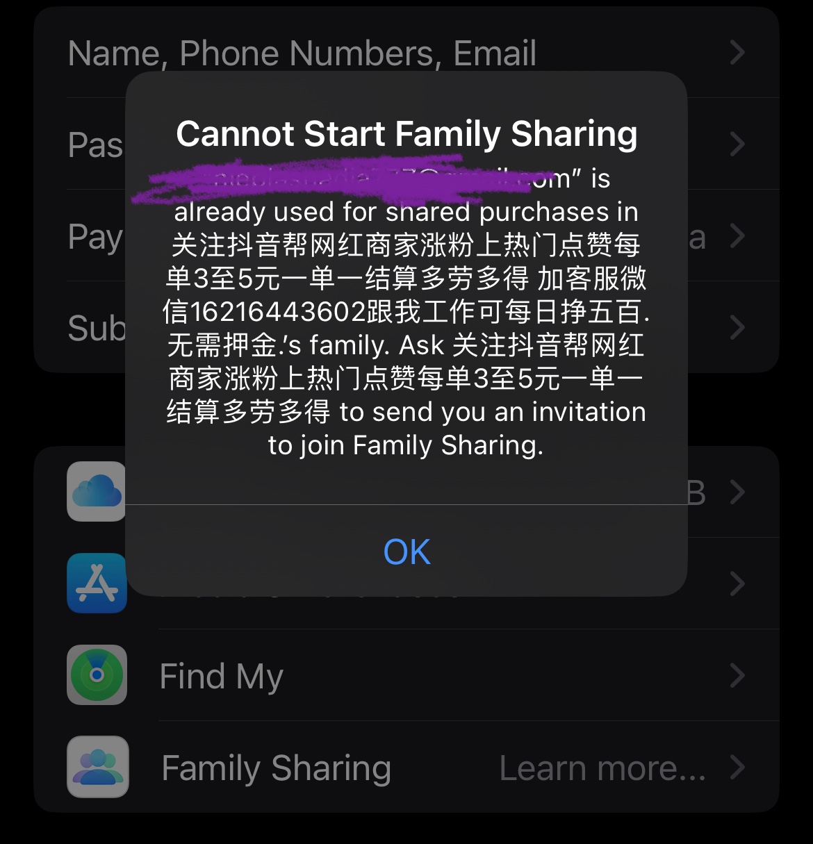 When I try to access Family Sharing, a message in strange symbols appears telling that my email is used in another family group. What can I do to solve this issue?