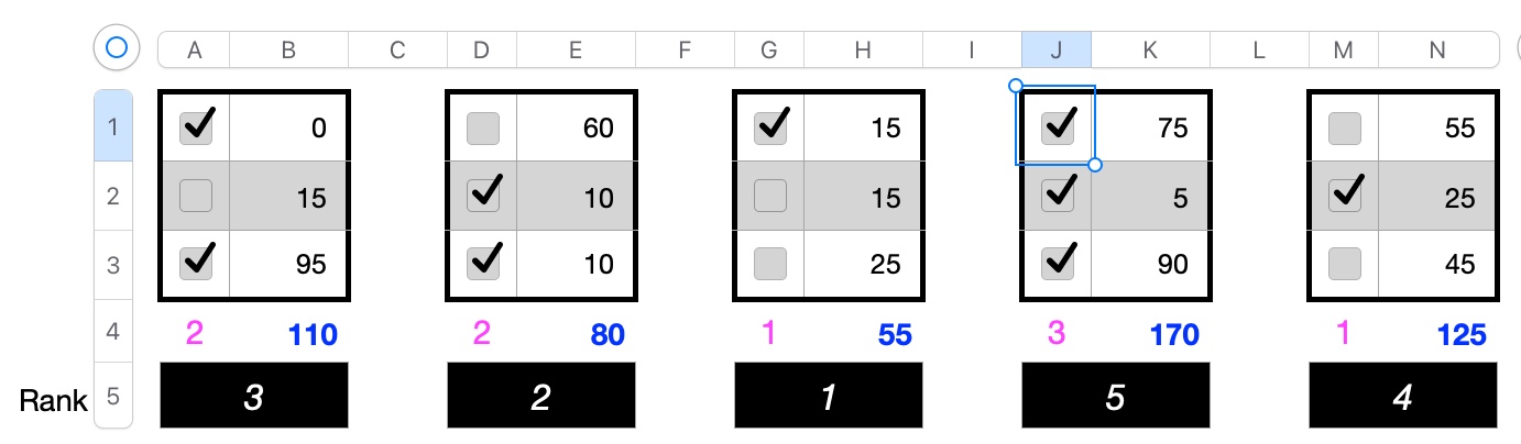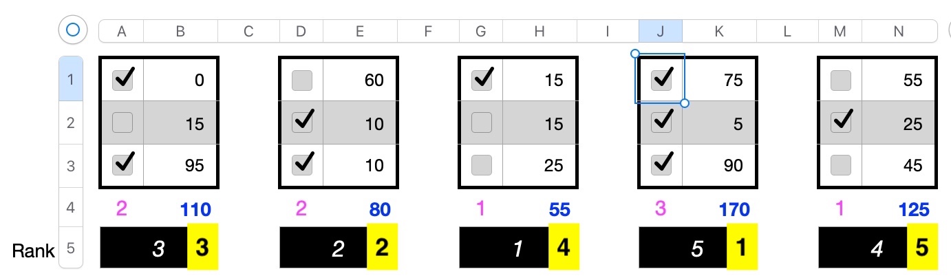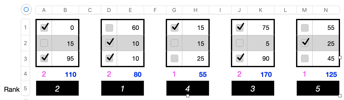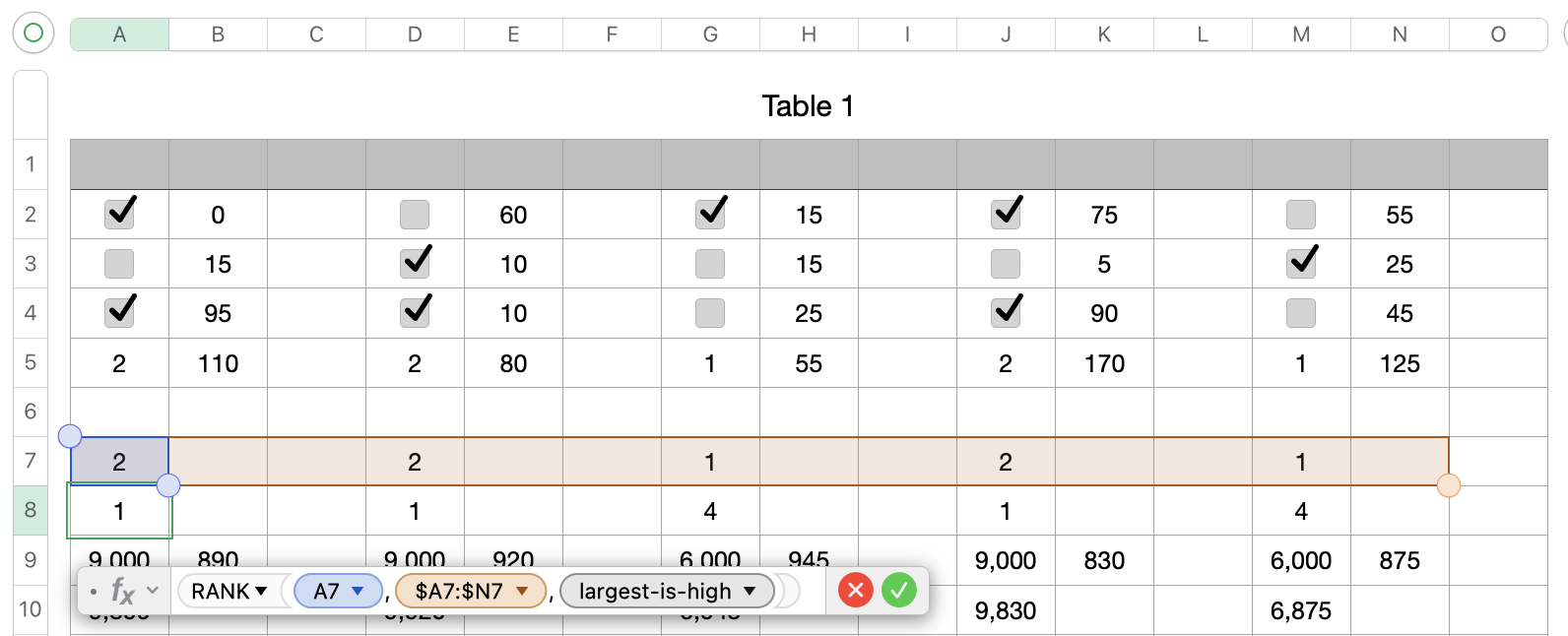 Row 7 is a simple copy of the count for the checkmarks in row 5, this will make the RANK formula in row 8 easier.