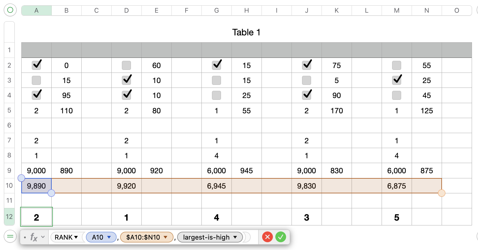 Formula for A12=RANK(A10,$A10:$N10,largest-is-high)