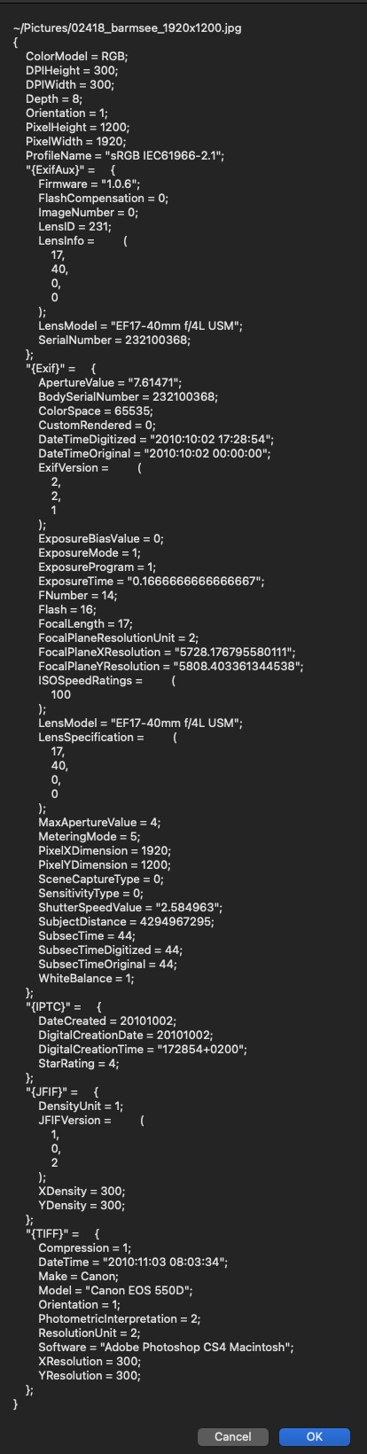 that will install ~3GB of additional development stuff on your Mac. However, the benefit is that I have an AppleScript that uses a Swift handler in it and it extracts all of the metadata from a selected image and displays it in a tall AppleScript Display dialog where you can copy paste items from it. This works for supported camera RAW images too.