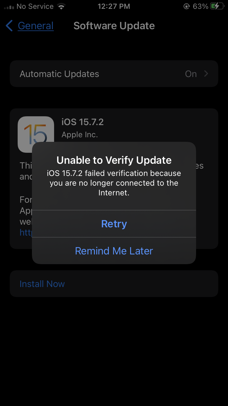 When i try to update my ios somethings pop up and it says failed verification you are not connected to the network even though i am connected to a wifi