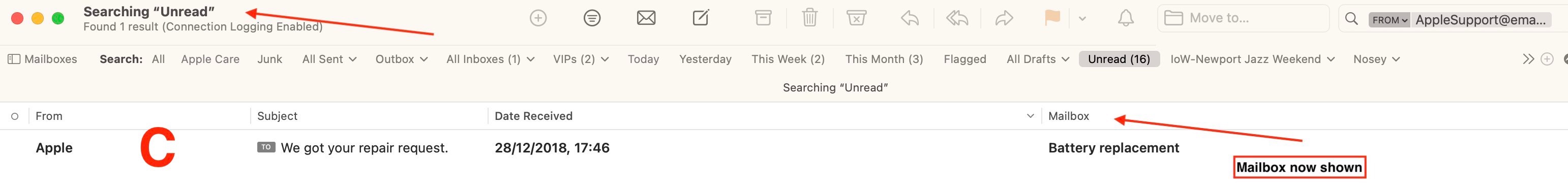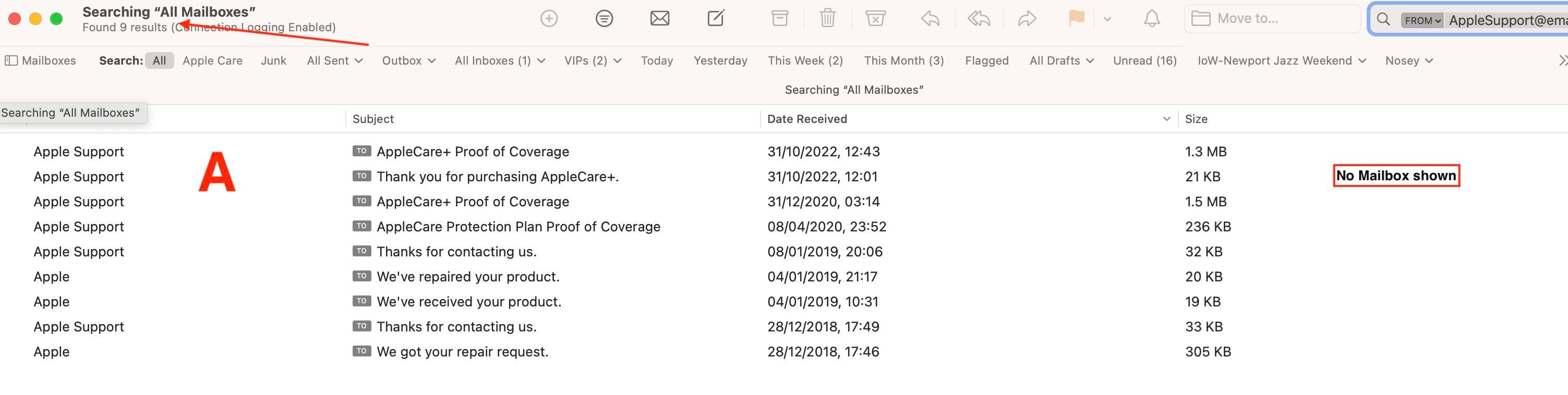 When I use the search function in Mail it does not display the mail folder in which it was found. I try and keep my inbox empty by using many folders. Am I missing a display option in View?