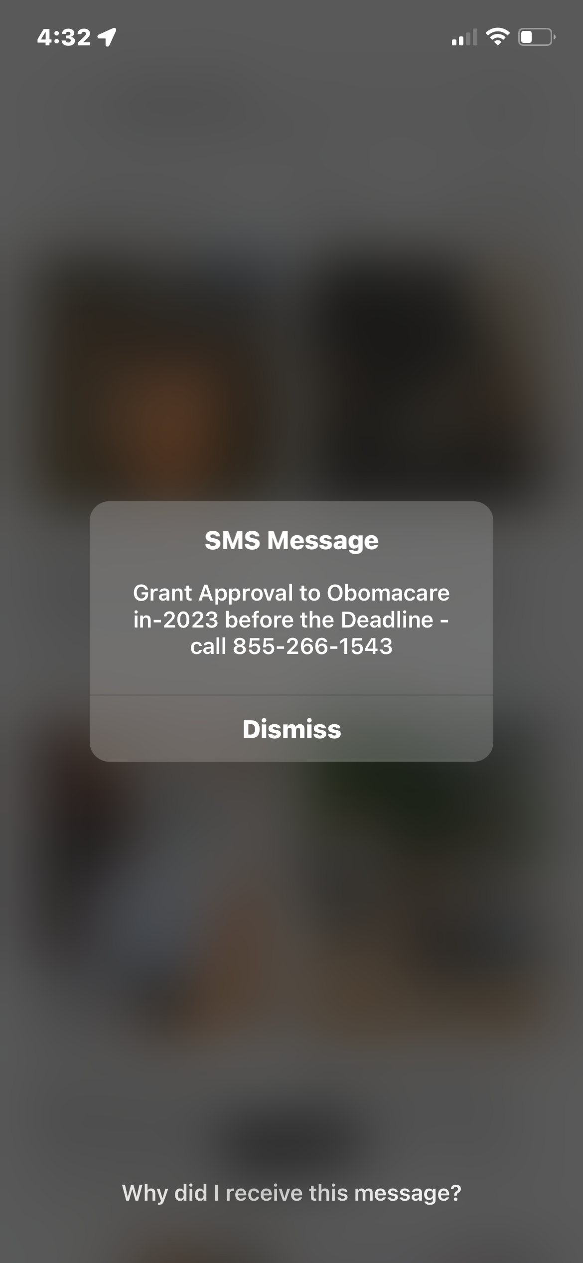 This has happened several times. The messages is always different and the entire screen goes grey. I take a screenshot and force restart the phone. Obviously I do not want to click the link or the “dismiss” option.