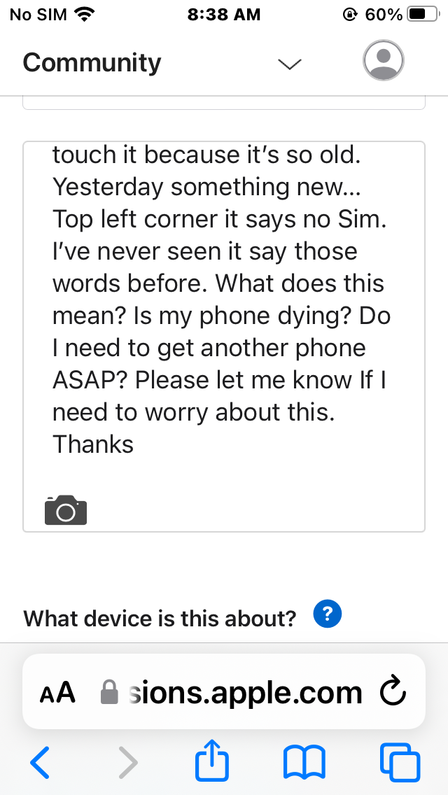 My iPhone 6s… It’s old and it doesn’t stay charged very well. Took it to an Apple Store and they said they won’t touch it because it’s so old. Yesterday something new… Top left corner it says no Sim. I’ve never seen it say those words before. What does this mean? Is my phone dying? Do I need to get another phone ASAP? Please let me know If I need to worry about this. Thanks I will try to add a picture of my screen.