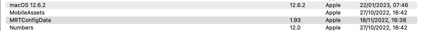 Regarding MRT installed software. Since the system is new only one MRTConfigData line displayed in the system report for installed software & is the most up-to-date for Monterey :