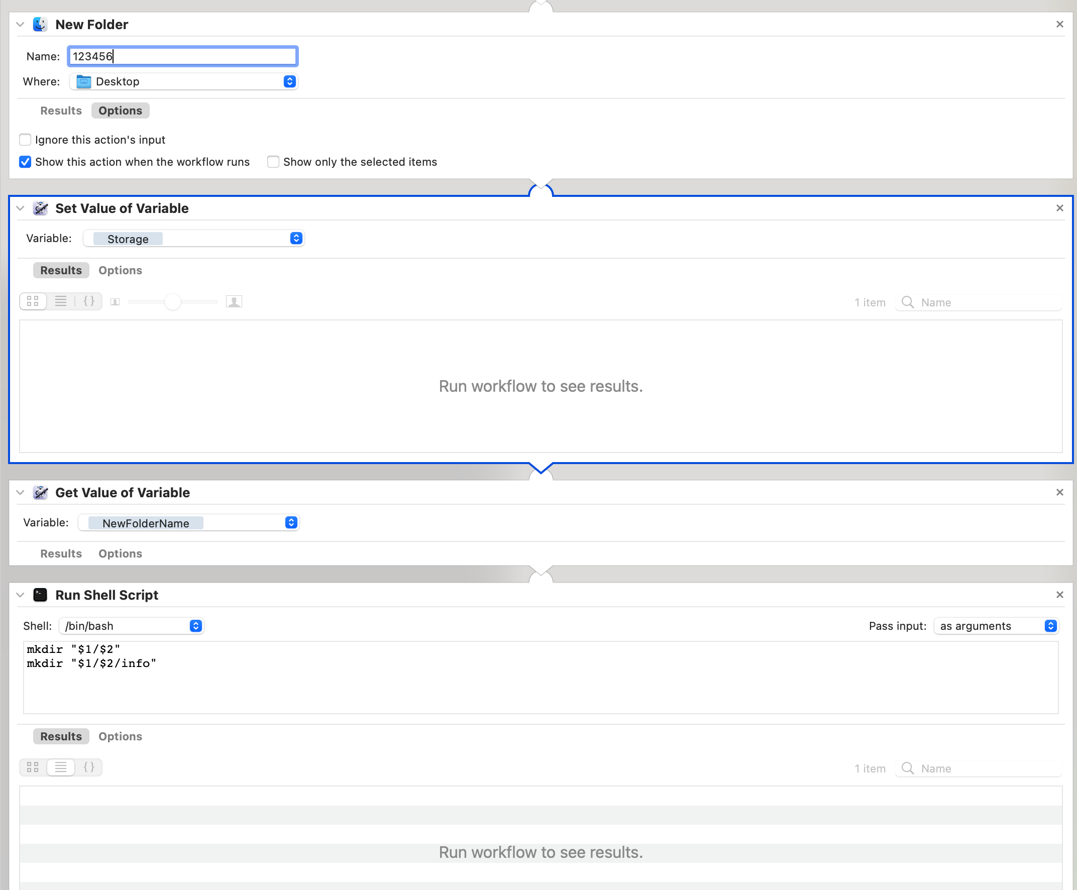 Automator passes two arguments into that shell command, which are represented as $1 and $2 in the mkdir commands. When the mkdir command is invoked, $1 is replaced with the first argument, and $2 with the second.