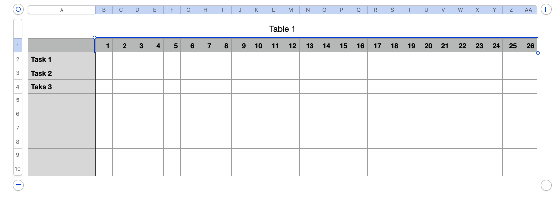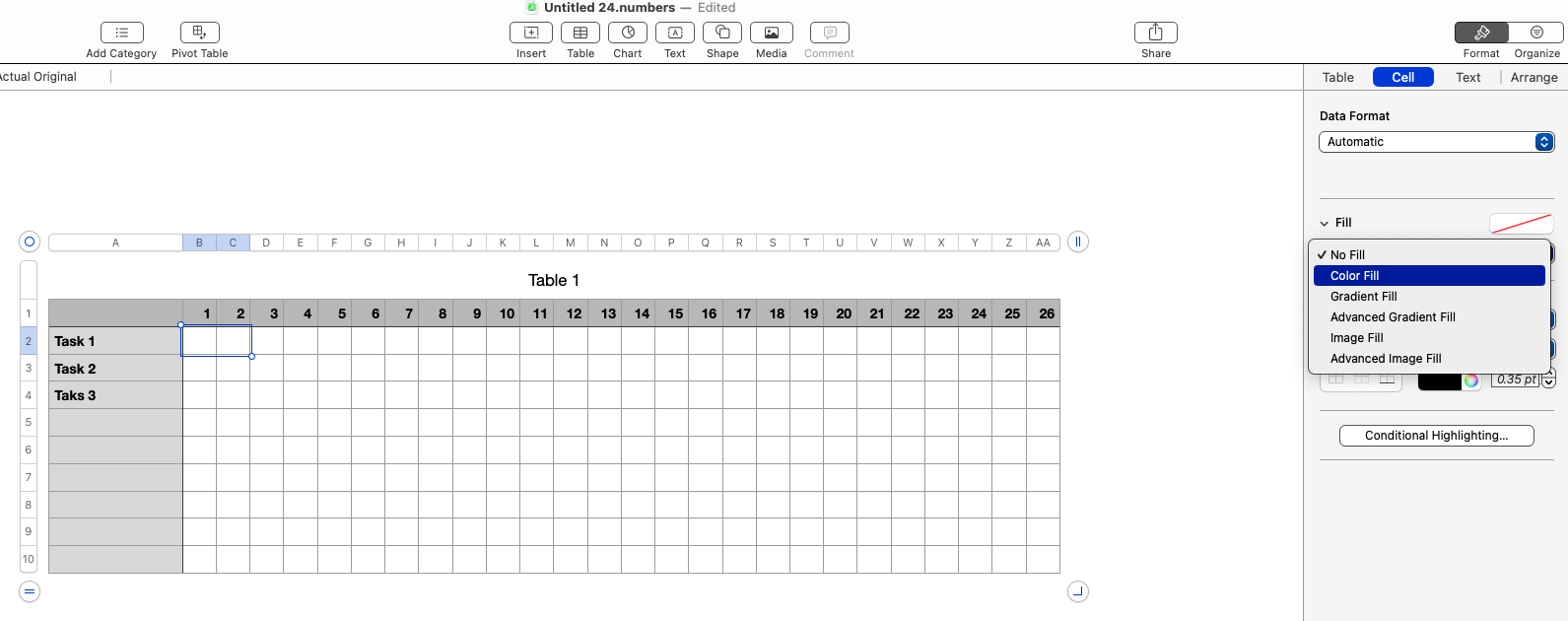 then for each task, select cells on the same row and between the weeks, then choose the fill controls to assign a fill color
