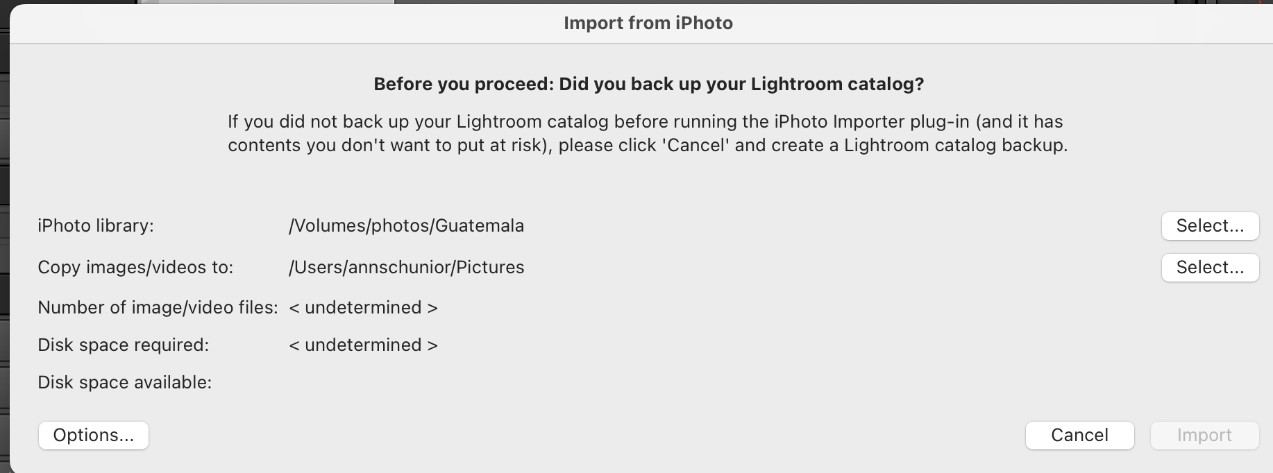 I'm FINALLY leaving Aperture and migrating to Lightroom. Following all the directions I can find on the web using Lightroom's Plug in Extras under File. Photos are on an external hard drive. I can locate my Aperture libraries and select one. (Some are .aplibraries, some iPhoto but they're all visible) Then to OPTIONS and check all and hit OK. At this point, the IMPORT button should let me import, but it's grayed out. Not sure where the problem is.