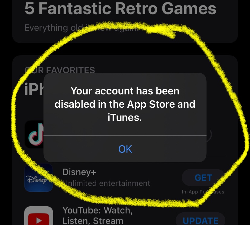 I keep getting the error box “Your account has been disabled in the App Store and iTunes Store.” How do I fix it?”