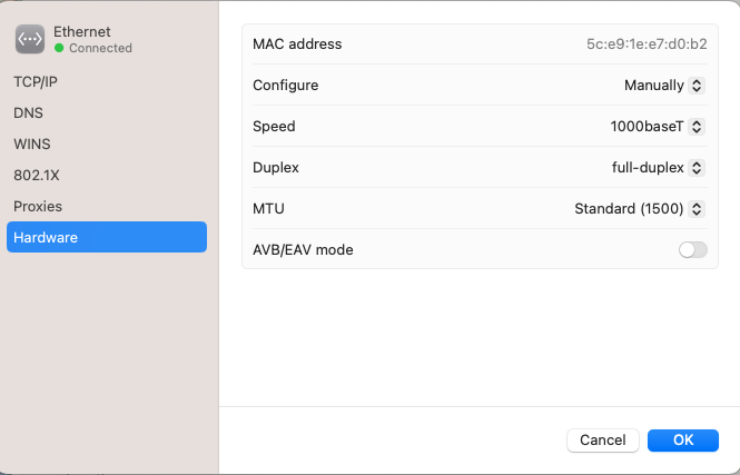 Ok, I've just changed a setting in the network hardware pane for my Ethernet connection: