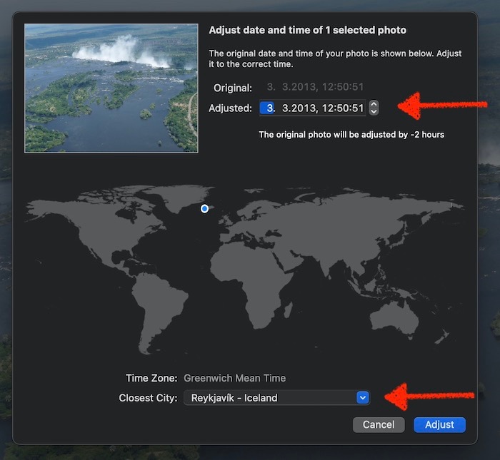 You may also want to check the "Closest City" at the bottom of the panel. Make sure, the selected Time Zone strip and the closest city correspond to the Time Zone the camera has been set to, when you took the photo.