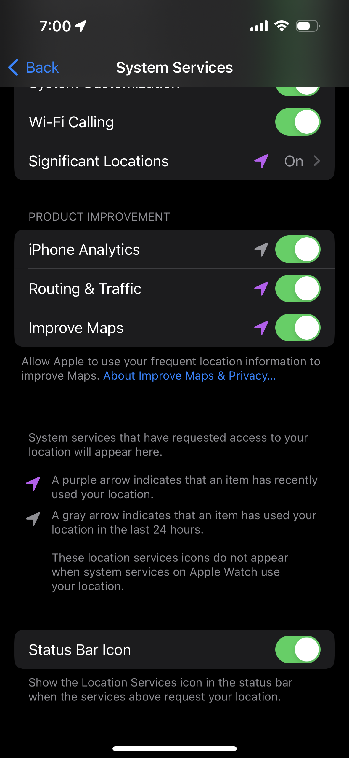 My current 14 pro shows purple arrows for a lot of apps, not just those 3; I have 7 lit in System Services and 2 other apps, all showing purple. My battery life is incredibly good. By your hypothesis it should have shut off with low energy hours ago.