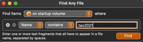 When I went to find last year's data (2021) I could not find it or any turbotax data. I searched for a .tax file in Finder. I followed Intuit help advice for locating the files using Spotlight and did not find them. I still have Turbotax 2021 on my computer and it can not locate the 2021 files. Does anyone have suggestions on how to find these files?
