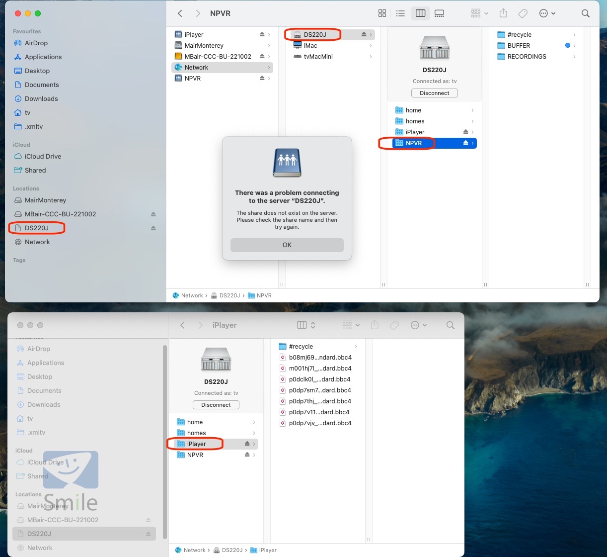 When I boot up I keep getting a popup dialog saying "There was a problem connecting to the server "DS220J". I've tried everything I can think of including trying to delete server from network connections and re-installing Monterey. Running a MacBookAir 13" Early 2015. Ethernet and WiFi active. 2 other Mac's do not have the same problem. Both running Ventura.