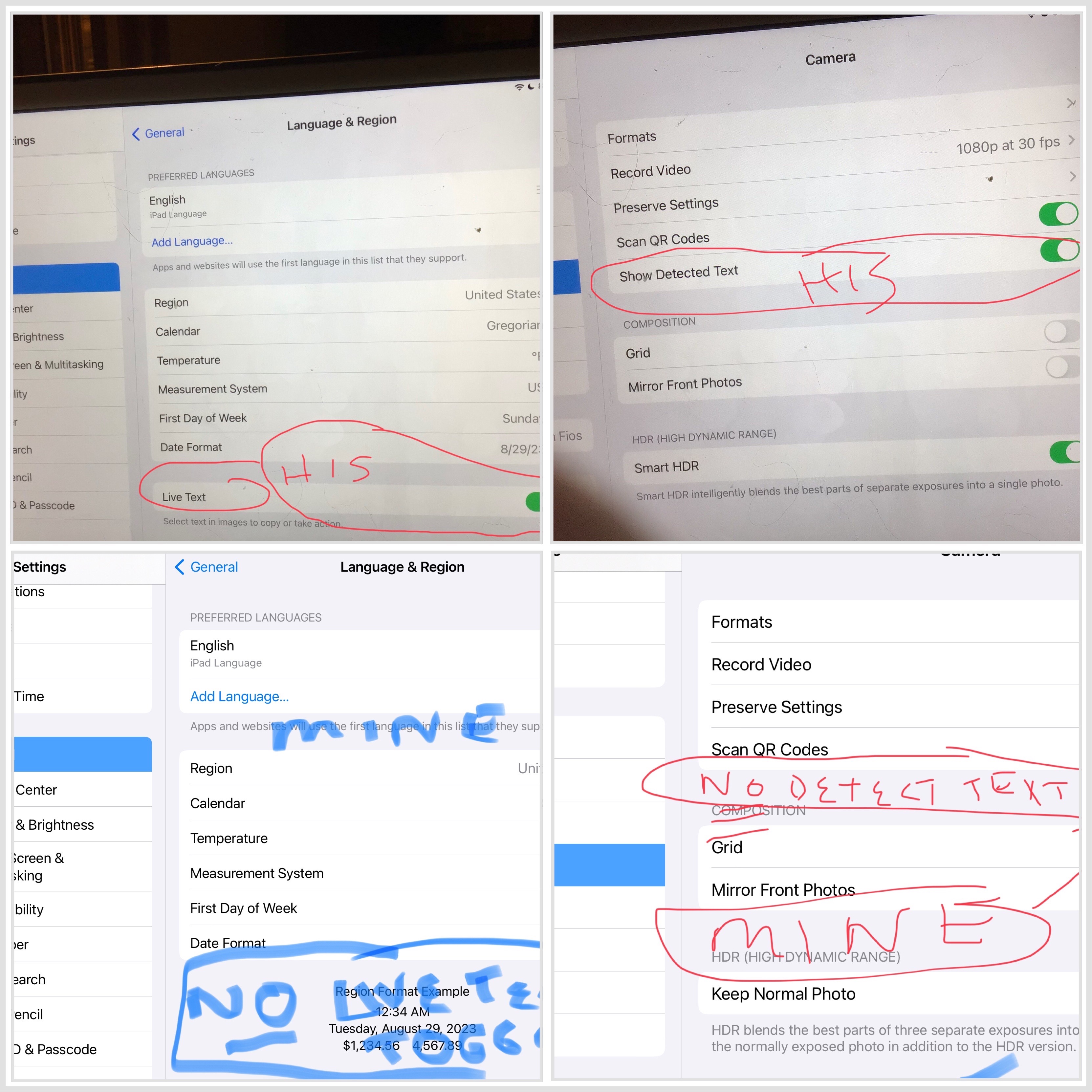 How do I get the settings toggles to turn on live text? My iPad has iOS 16.2. There is no toggle to turn it on under camera settings or under languages and regions. My camera will also go into live mode, but there is no option for text. My husband has the exact same iPad, and our settings are exactly the same, except I updated my iPad earlier than he did period. His iPad has the toggle under camera, it has a toggle under languages and regions. Both of our systems are exactly the same, except i have NO live text option. It was supposed to be automatic with the iOS 16 update, and it’s not even a selectable item on my iPad. After this last update my text dictation doesn’t work in mail or Facebook messenger. Since we can’t go back and reload updates, How do I turn on something that’s not there when it’s supposed to be there? How do I turn on live text when there is no toggle? What do I do about my dictation problem please help