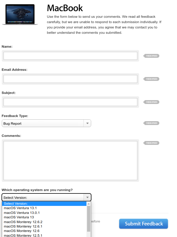 I'll do product feedback. Ventura 13.2 is not yet on the MacOS list, only Ventura 13.1. Thanks for pointing that out as I had no idea where to report this.