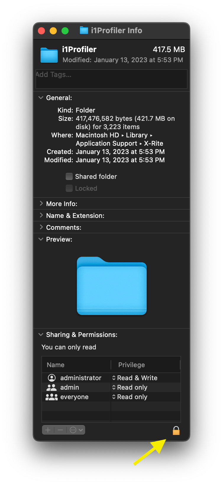 i1Profiler does not have valid permissions to save files. Please make sure you have read and write permissions on the following directory and its subdirectories: /Library/Application Support/X-Rite/i1Profiler