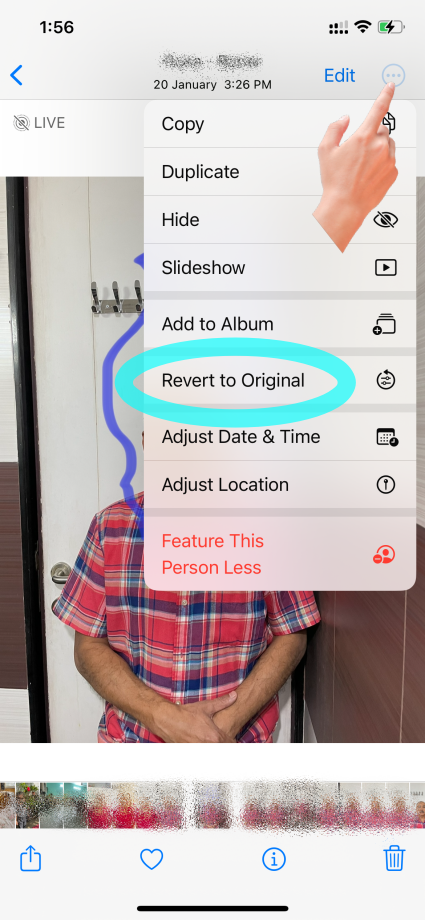 Open the Photos app and tap on three dots on the top RH side then tap revert to Original