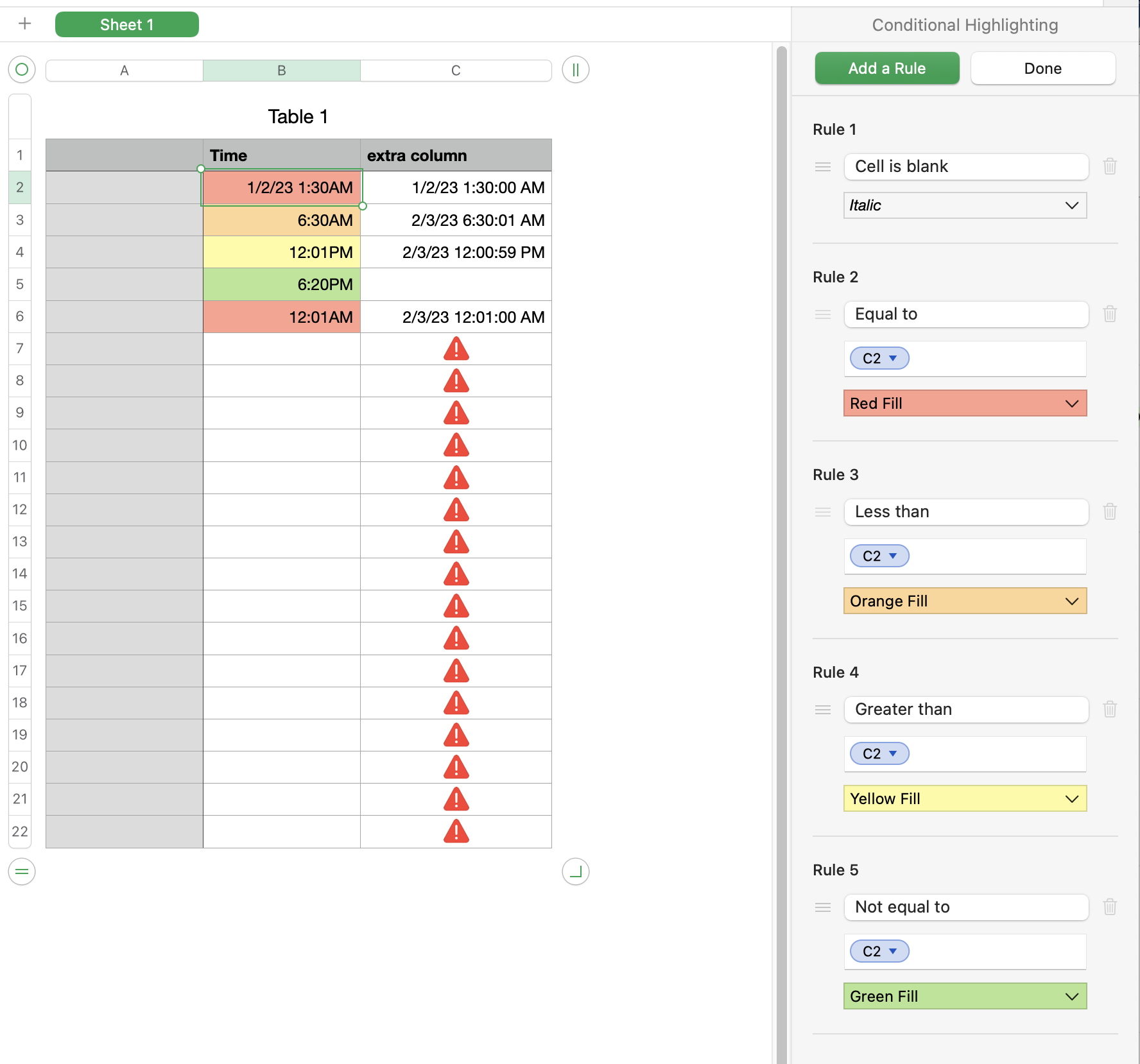 Rule 3 has the highlighting changed from 'fill the cell' to a 'custom format' that says 'fill the cell with green' AND colour the text 'green', effectively hiding the Time Value fraction in the cell. One difficulty with this is that the fill colours are named in the custom format menu, but the text colour settings are chosen from a 'colour patch' table, which may mean some of the named colours do not have an exact (or very close) match on the 'colour patch' table.