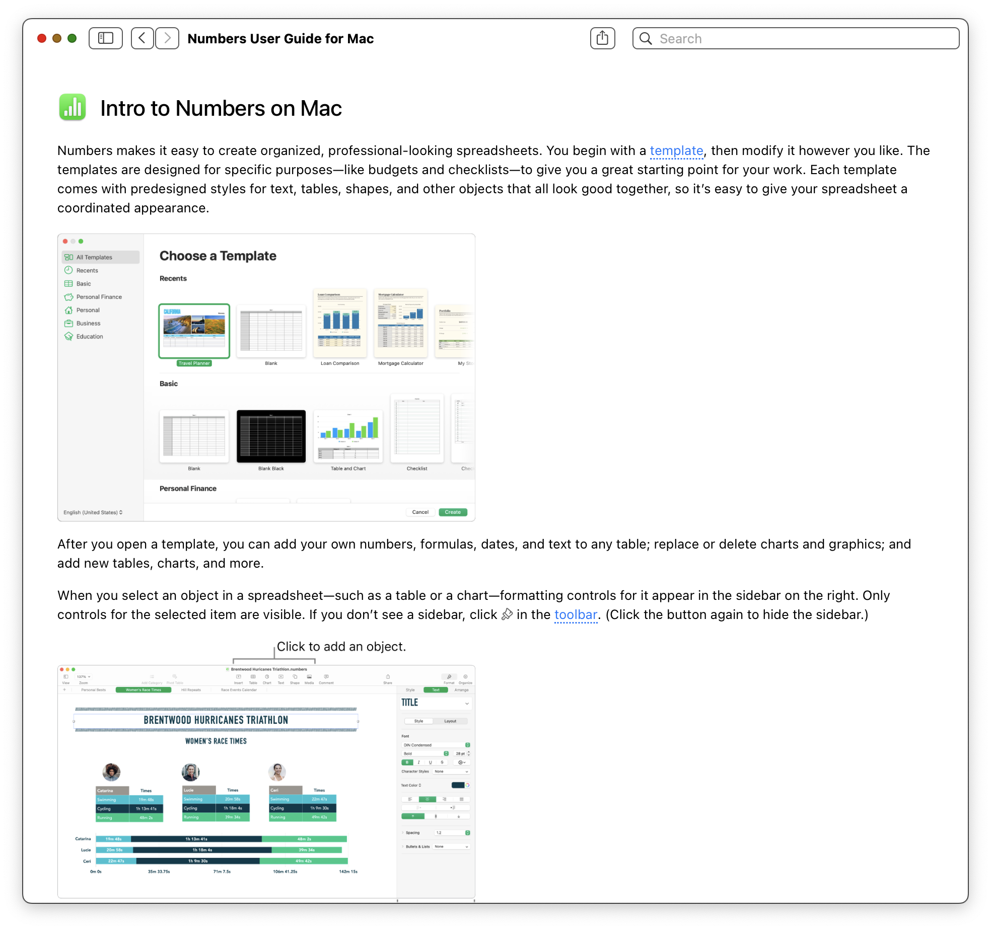 then open the sidebar by single clicking the icon to the right of the green dot in the top-left corner. Then choose "Numbers basics"