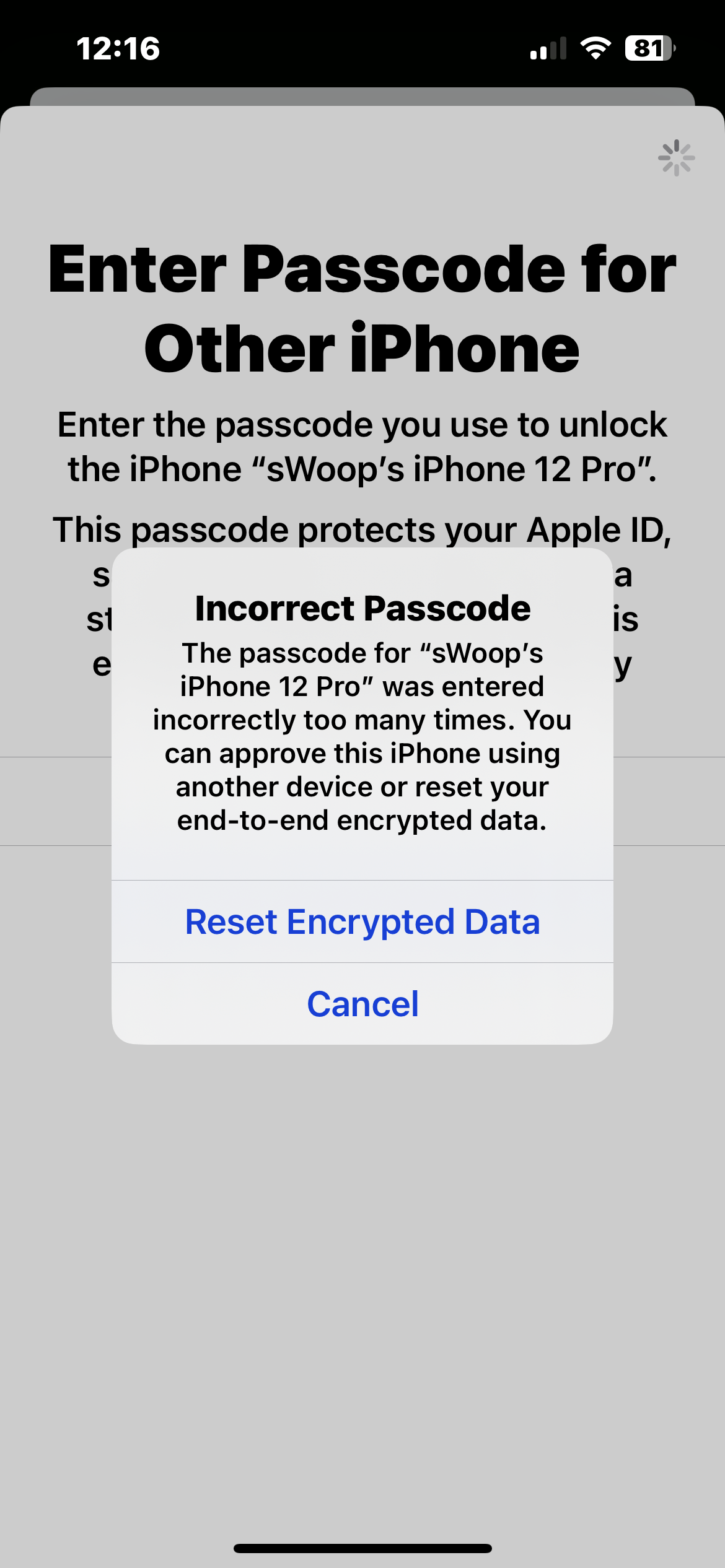 The passcode for ‘Scott’s iPhone 12 Pro‘ was entered incorrectly too many times. You can approve this iPhone [the 13 Pro] using another device or reset your end-to-end encrypted data.”