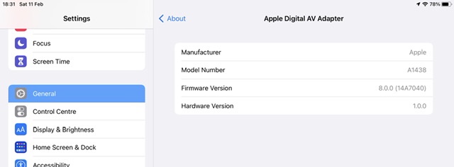 While connected to your iPad, the Digital AV Adapter’s installed firmware version can be verified from iPad settings: