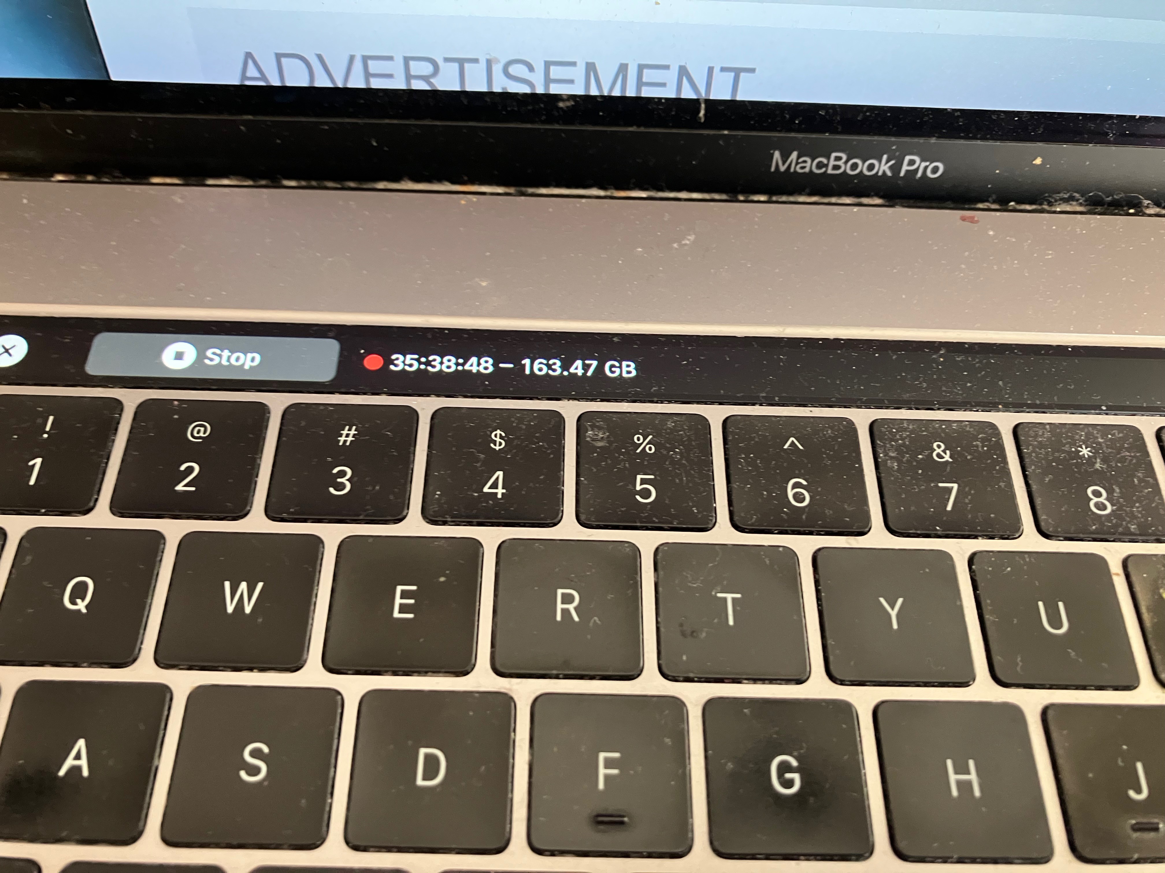 Weird -Ventura 13.2 mac pro, today screen started dimming several x while using to black, brought brighness up. Then ribbon showed something odd - red dot like recording, (wasn't) & apparent time notation and ‘167.47 gb’ and stop button, took snap. What the heck happened? Was NOT recording anything. Restarted immediately in case of malware and backing up - but mystified. Excuse messy keyboard!