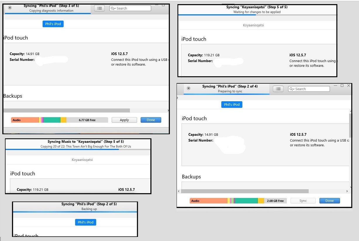 Look at the screenshot below, which shows five views of iTunes while it is performing a Sync (on two different iPods):
