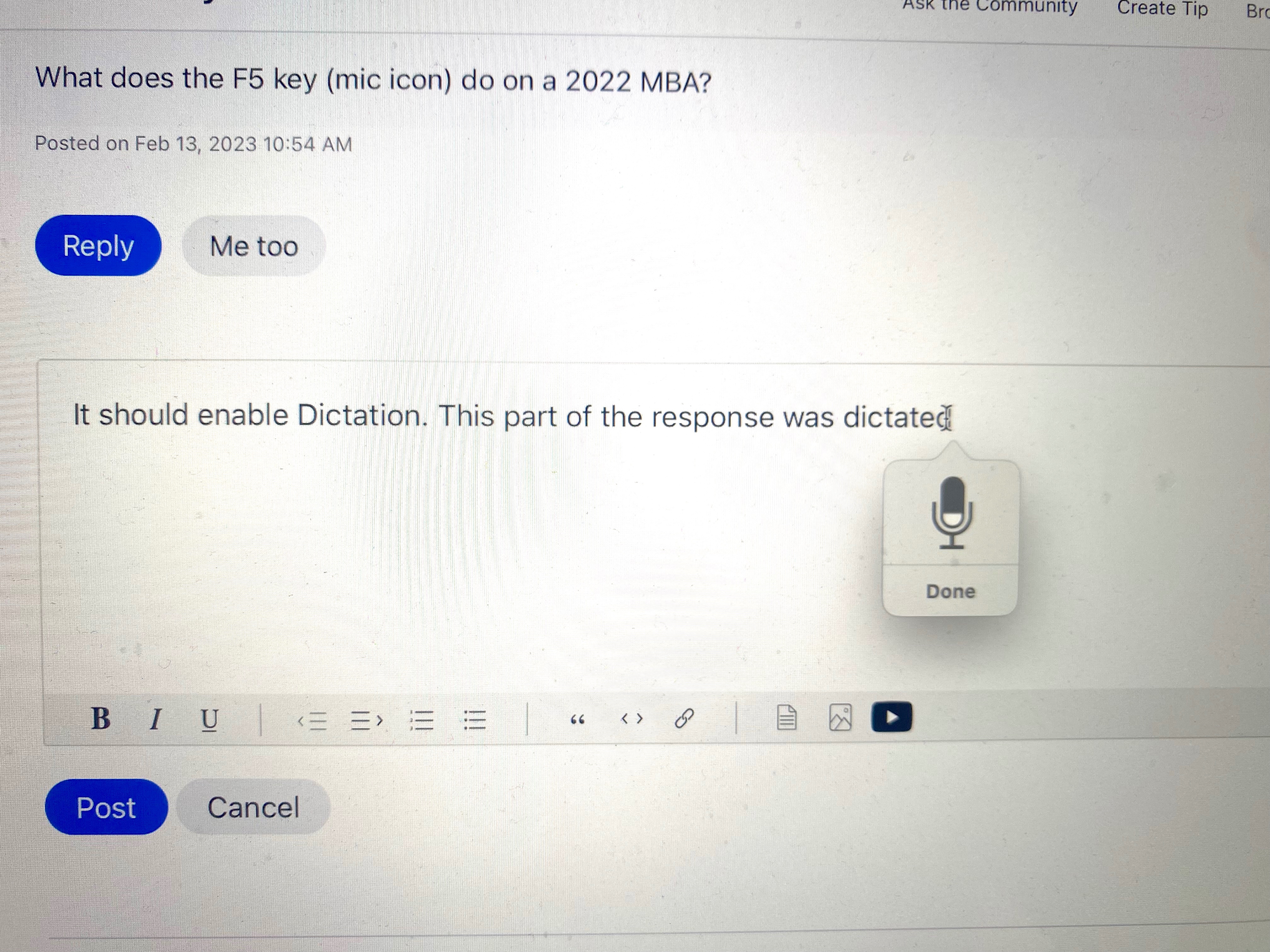 What does the F5 key (mic icon) do on a 2022 MBA?