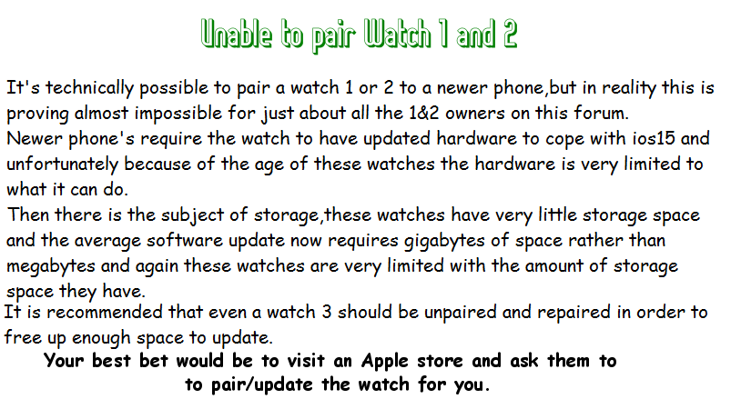 I have an older Apple Watch (One of the first generations) and after not using it for a while I decided to turn it back on and try it again. When I'm pairing it with my phone (iPhone 12 Pro Max) It will pair and get to the software update screen, where it either gets stuck and unpairs from the phone or it says "checking for update" for a minute before either getting a time out error or, mainly, an error that says I am not connected to the internet. I've tried both 5G Wi-Fi and 2.4Ghz Wi-Fi and the problem persists.