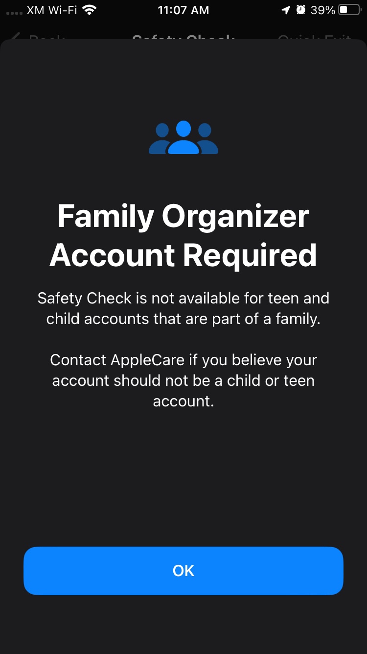 I ran the new Safety Check feature on my phone and thought, "this is an amazing feature I need to secure my children's phones immediately!" To my surprise I was blocked by Apple.