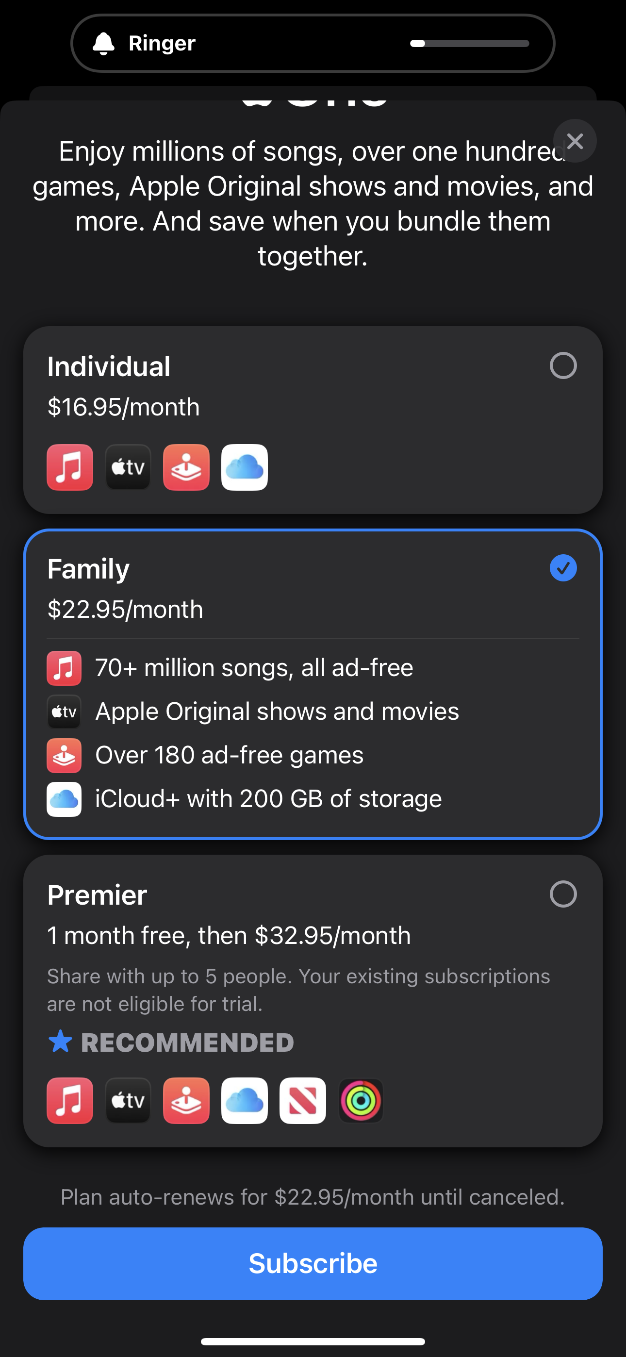 I was looking at my subscriptions under my ID and Apple popped up an option to bundle, I went out of the screen to find out what I was paying for everything to come back and see if it was a good idea but then I can’t find the option to bundle again. How do I bundle my music, etc now?