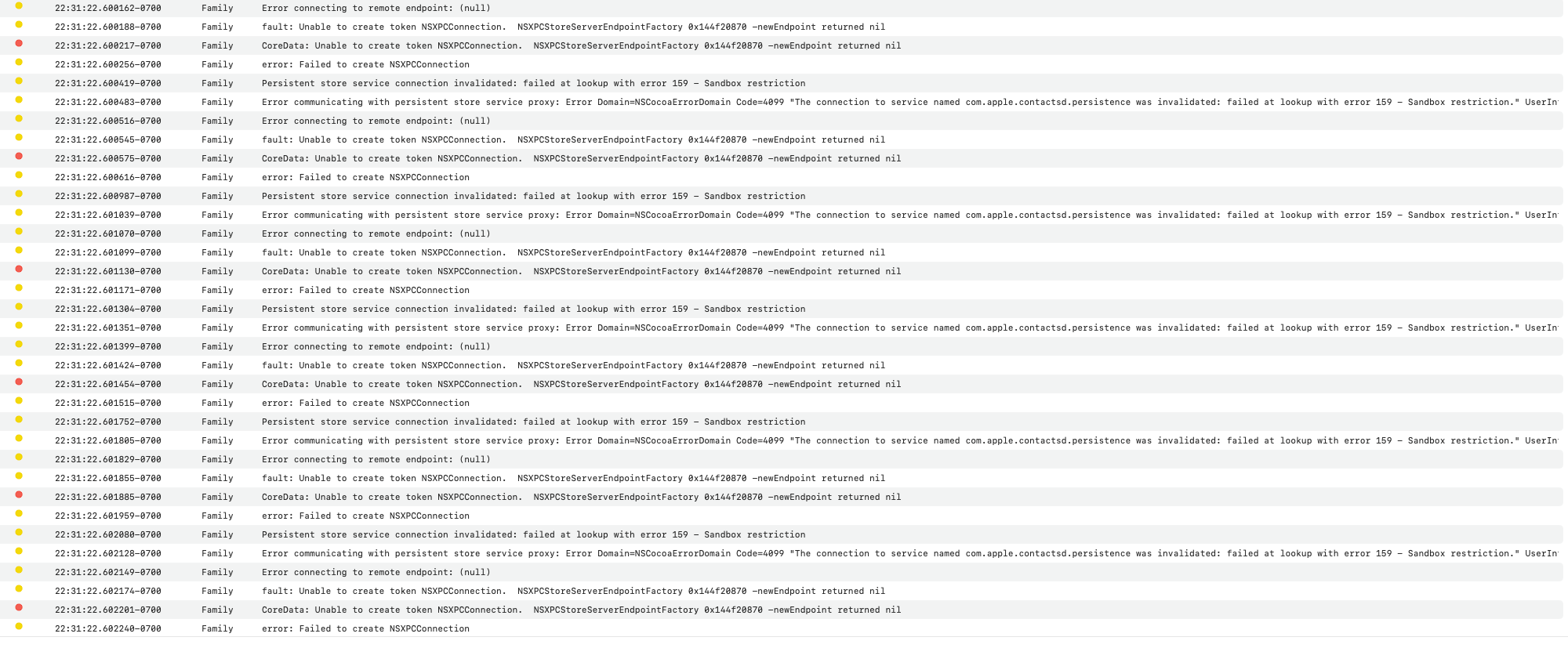 error 10:31:05.786854+0100 Family Error communicating with persistent store service proxy: Error Domain=NSCocoaErrorDomain Code=4099 "The connection to service named com.apple.contactsd.persistence was invalidated: failed at lookup with error 159 - Sandbox restriction." UserInfo={NSDebugDescription=The connection to service named com.apple.contactsd.persistence was invalidated: failed at lookup with error 159 - Sandbox restriction.}