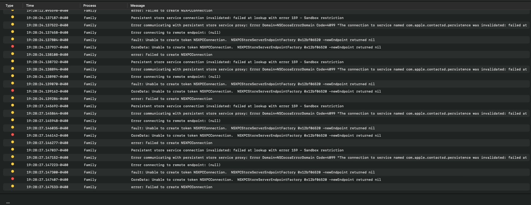 error 10:31:05.787983+0100 Family Error communicating with persistent store service proxy: Error Domain=NSCocoaErrorDomain Code=4099 "The connection to service named com.apple.contactsd.persistence was invalidated: failed at lookup with error 159 - Sandbox restriction." UserInfo={NSDebugDescription=The connection to service named com.apple.contactsd.persistence was invalidated: failed at lookup with error 159 - Sandbox restriction.}