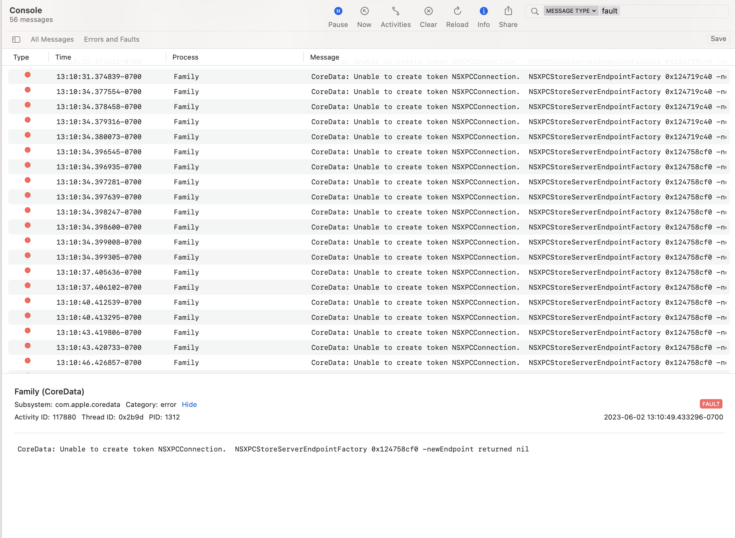 error 10:31:05.786941+0100 Family fault: Unable to create token NSXPCConnection. NSXPCStoreServerEndpointFactory 0x15766b710 -newEndpoint returned nil