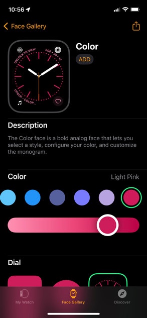 Some watch faces can have color accents that may include a ring. Here is the Color face showing how to change the color using the Face Gallery on the iPhone.