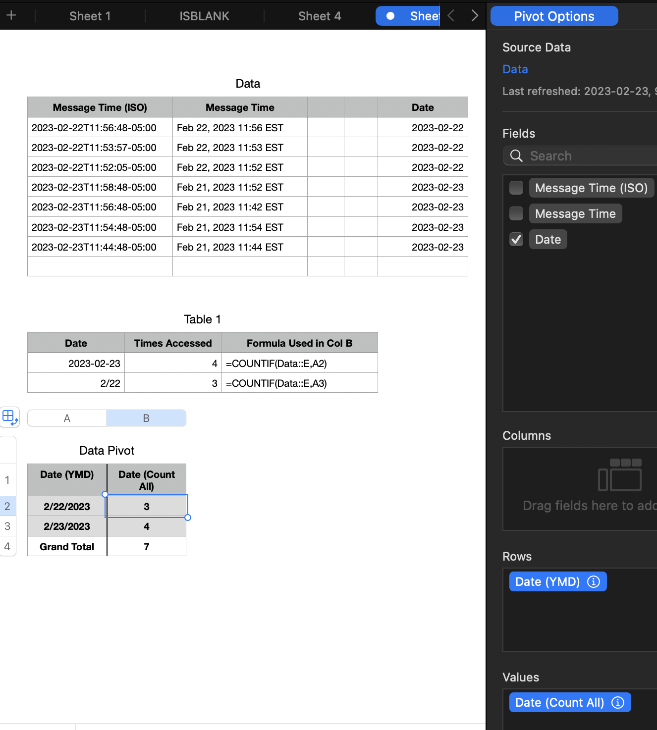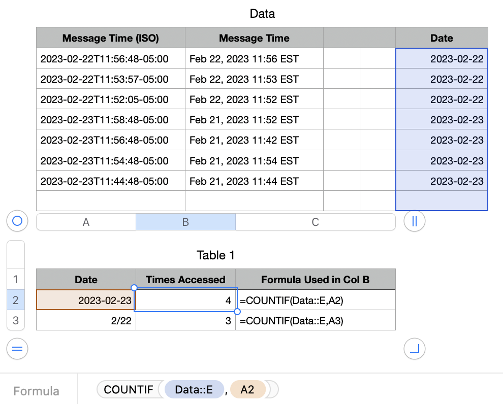 I am looking to create a spreadsheet that will be able to count the number of times a particular date appears in a list of dates & times. Below is a snapshot of the spreadsheet I am working with. This is access data for a security panel on a door. I am trying to count how many people access the door per day. I have been trying to use COUNTIF, but can't quite get the syntax right. Any help??