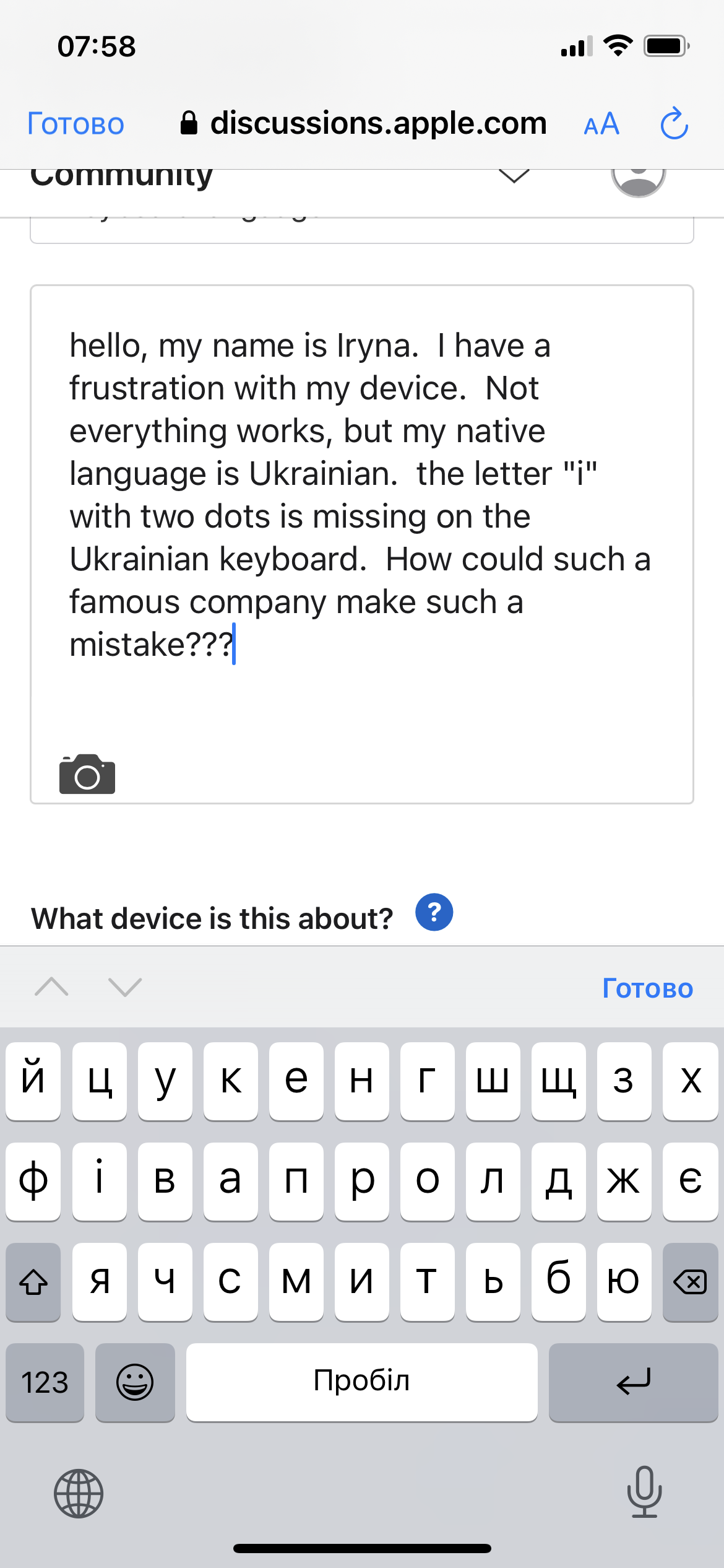hello, my name is Iryna. I have a frustration with my device. Not everything works, but my native language is Ukrainian. the letter "i" with two dots is missing on the Ukrainian keyboard. How could such a famous company make such a mistake???