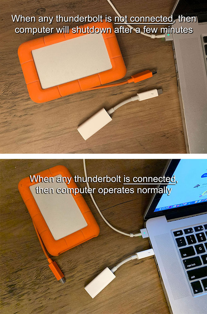 When any thunderbolt connection is plugged into computer then there are no shutdowns.