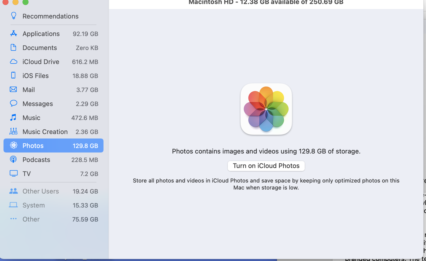 And there's this: when I look at that display on my own system, it says for Photos, 45.7 GB. When I add up the storage from my several Photos Libraries, it comes to 206 GB. In addition to that, I have another 350,000 other images on my hard drive. So I have no good idea of what those numbers in that display mean. I suppose someone does.